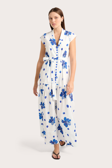 The Florina Dress in Wildflower features a soft flare and a button-down front that gives this maxi a clean finish. Featuring a tie belt to cinch waist, it’s an easy choice for everything from long lunches to late evenings.