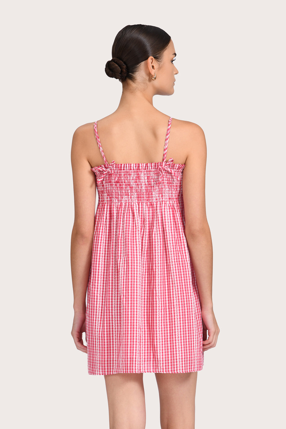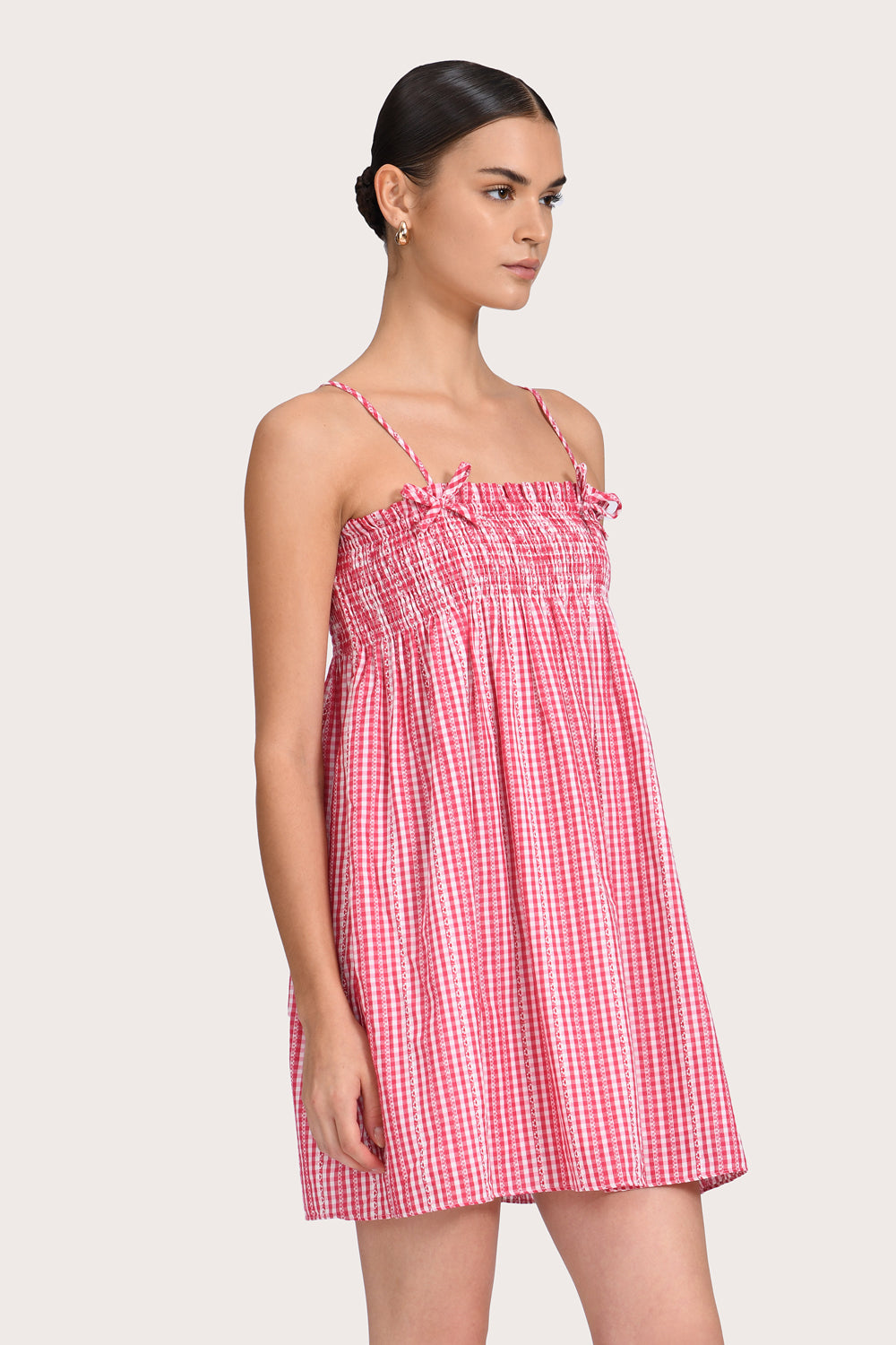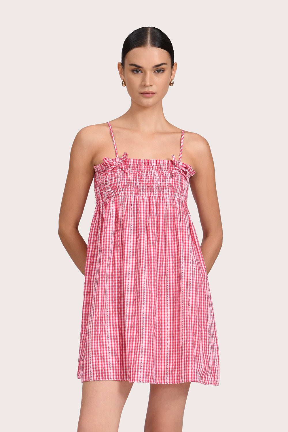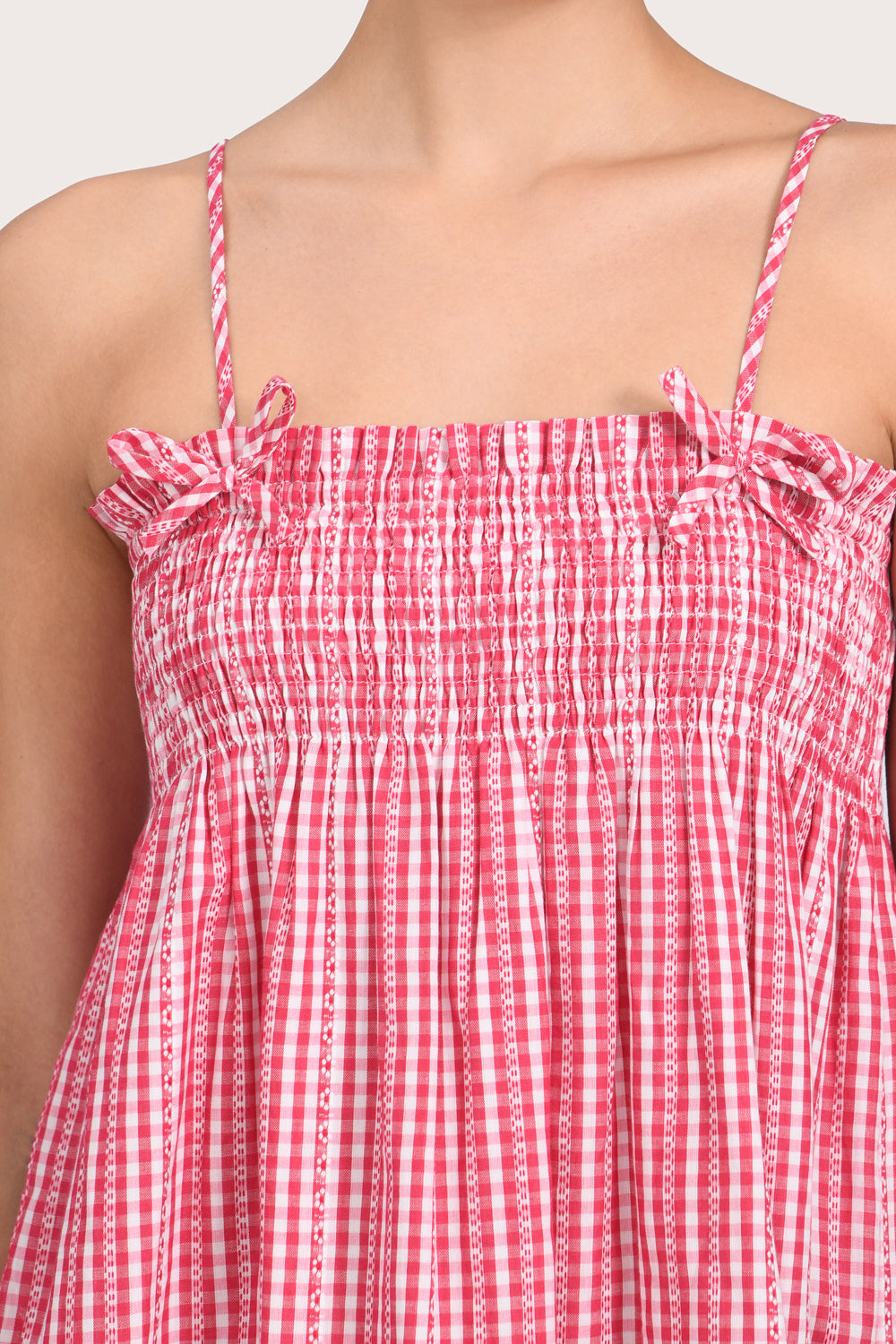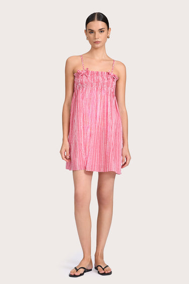 The Arlo Mini Dress in Cherry Check is an effortless mini dress with a straight neckline, adjustable straps and a shirred bust for the perfect fit. Designed in 100% cotton in a classic cherry gingham, it’s the perfect dress for sunny days and vacation wardrobes.
