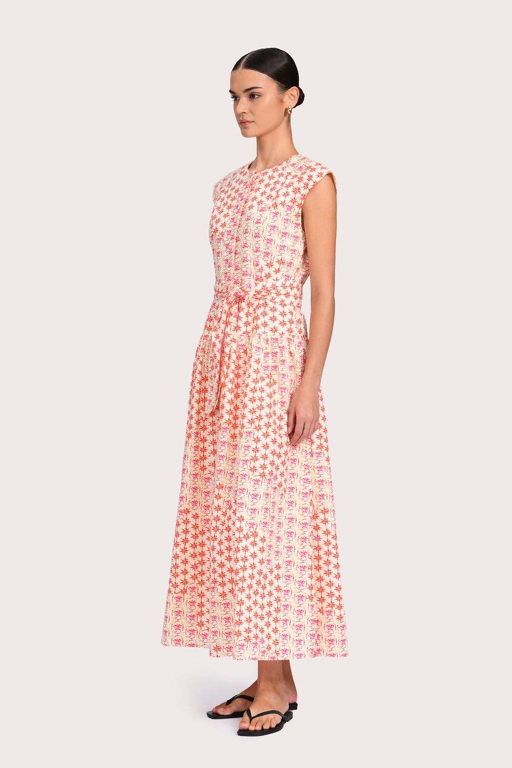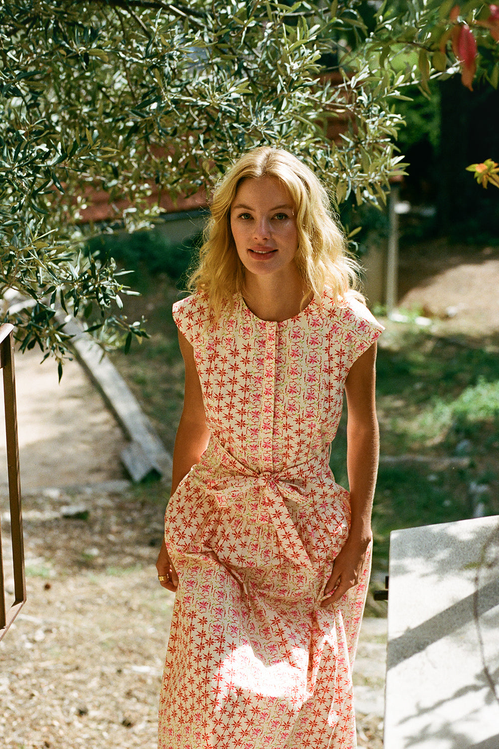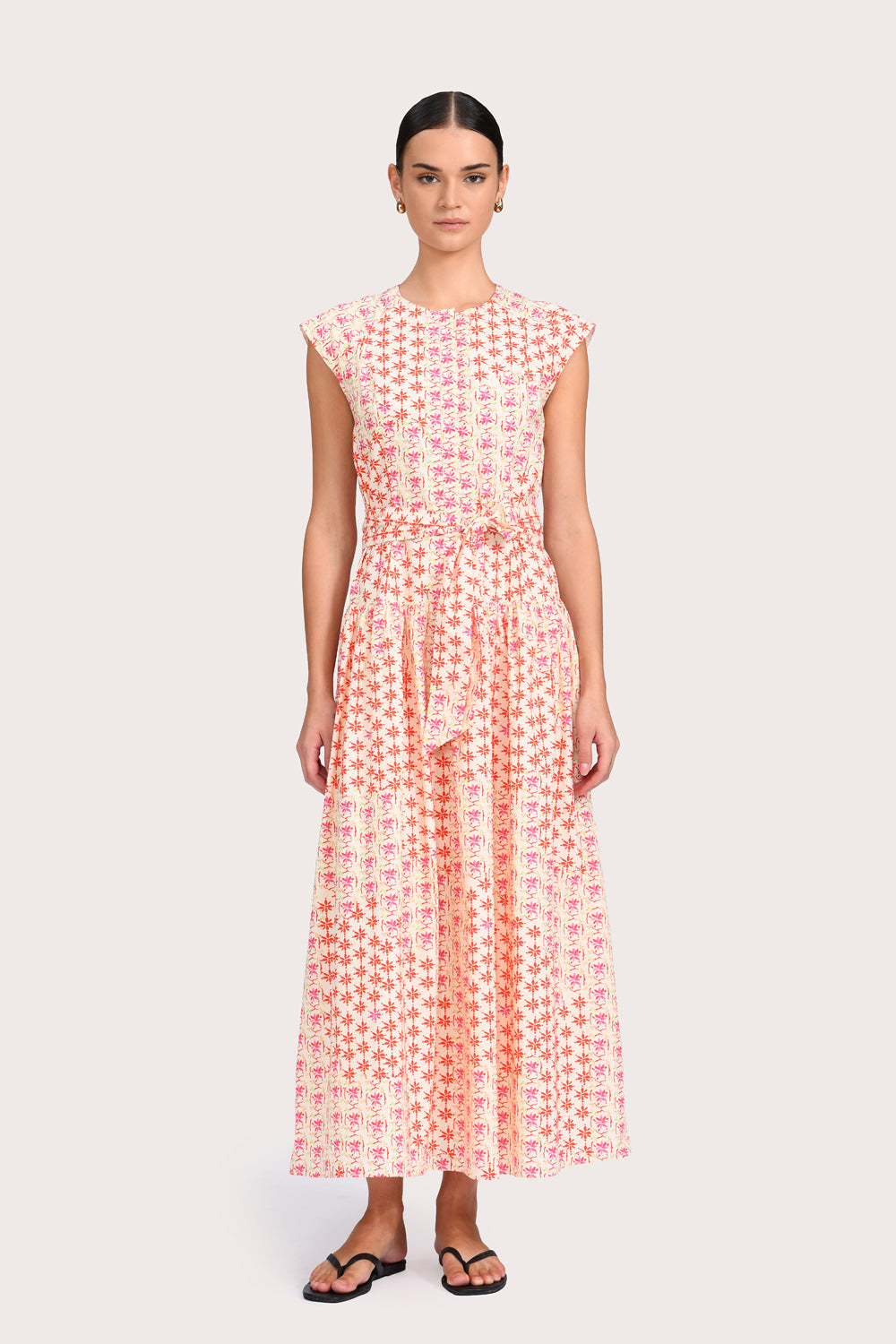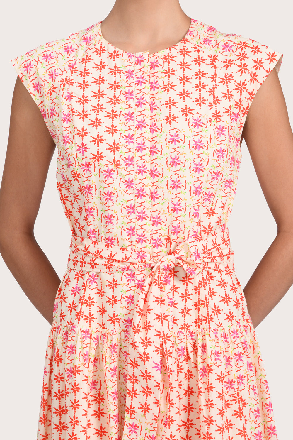 The Daniela Dress in Candisa floral is a feminine midi dress with a round neckline and short cap sleeves. Crafted in a cotton blend fabrication, it features a drop waist and a tie belt to cinch the waist. Style yours with a ballet flat or sandal for everyday dressing, or dress it up with a heel for your next event.