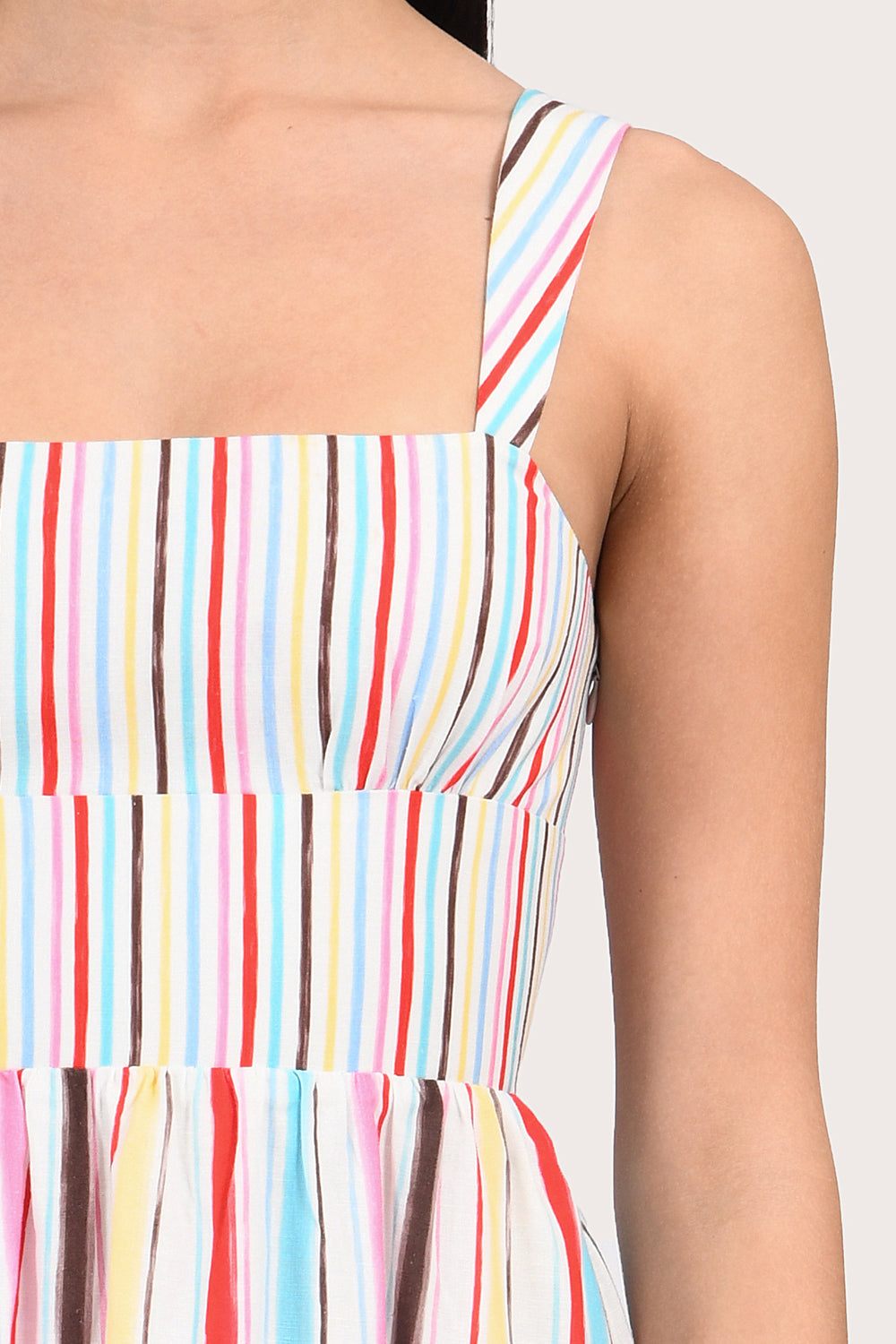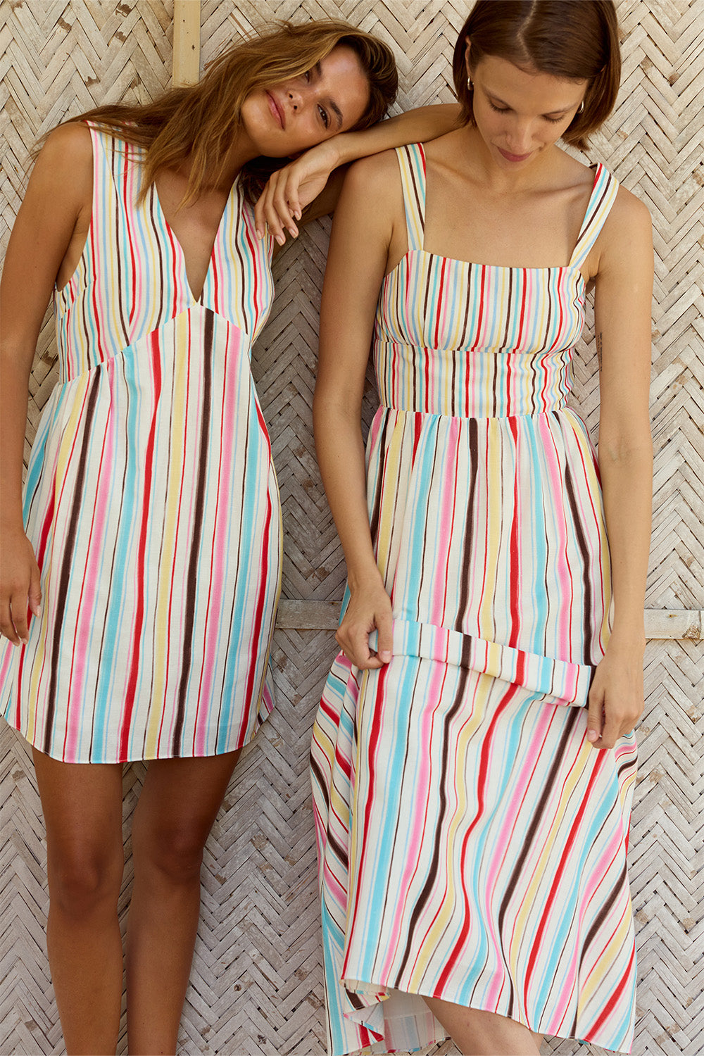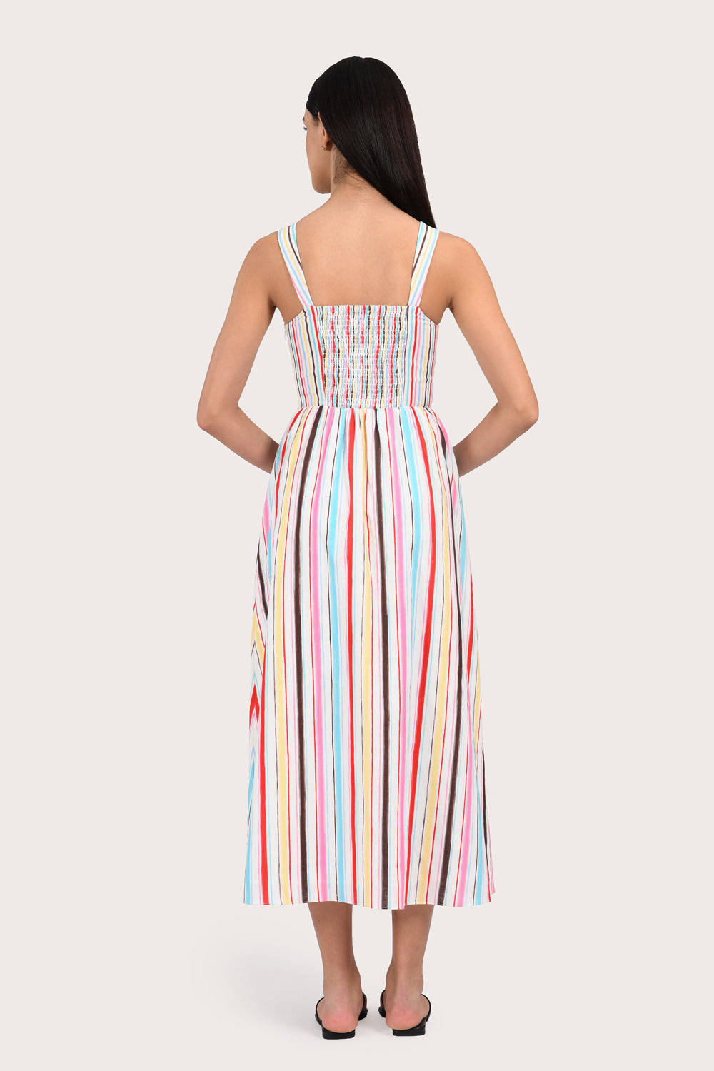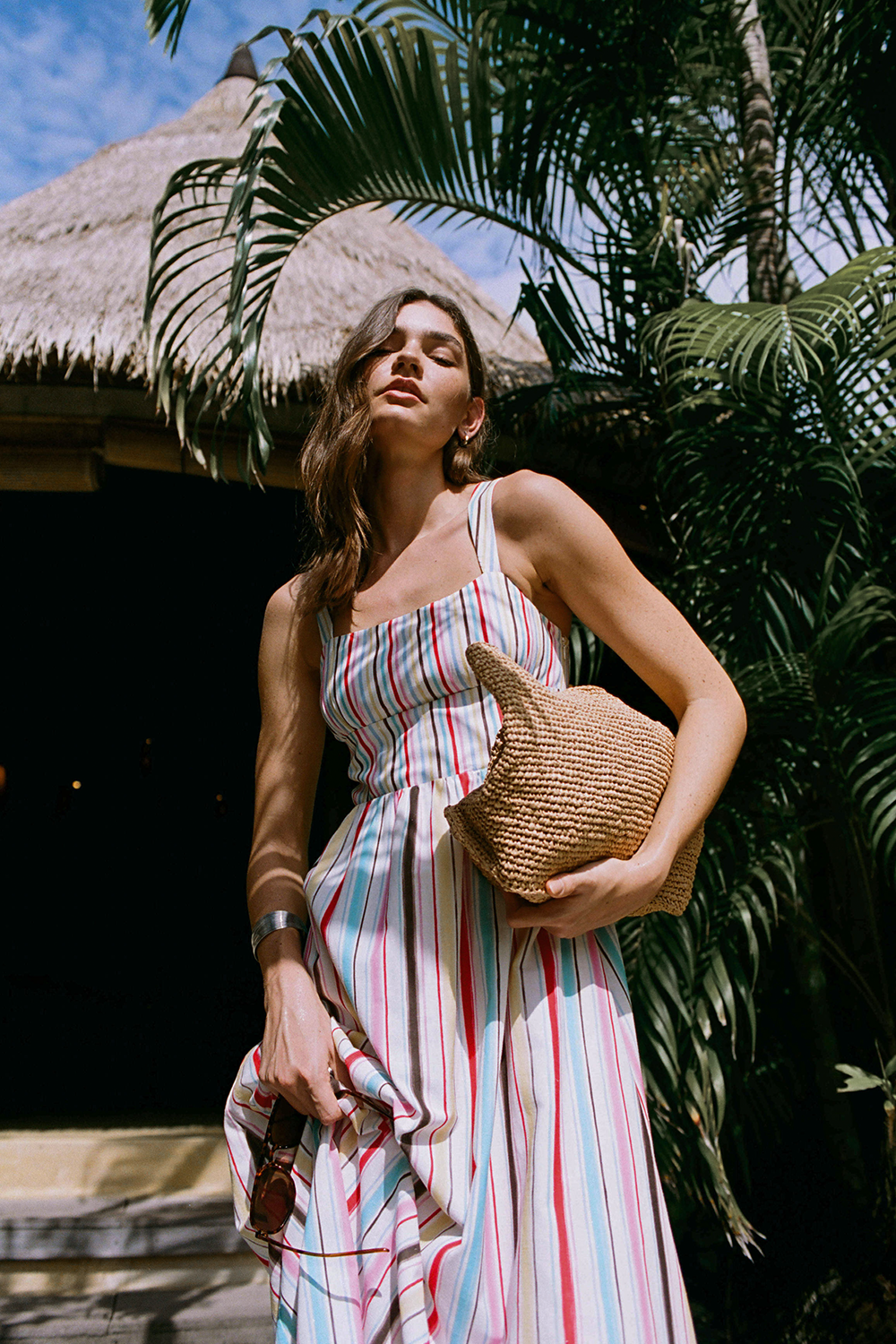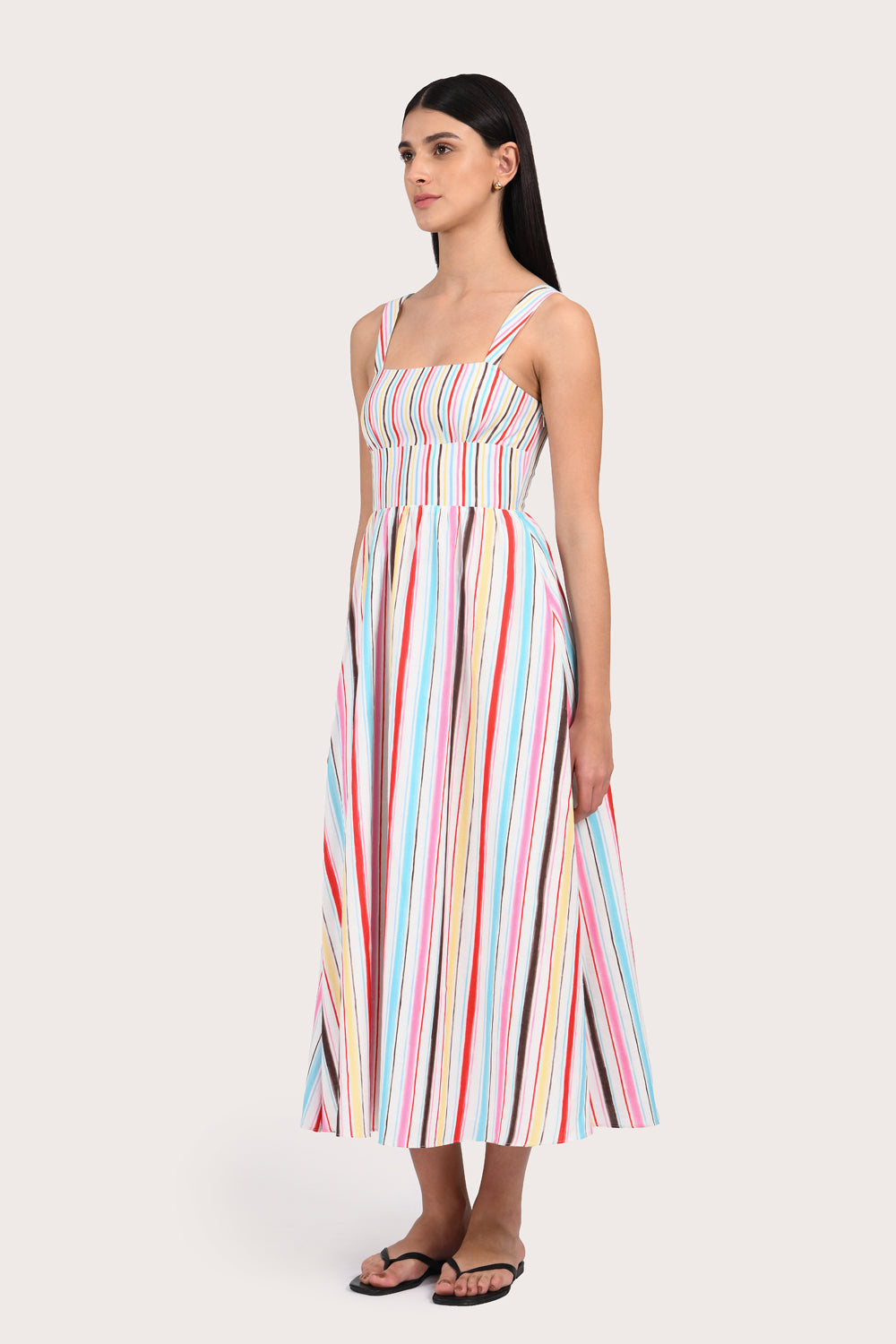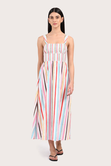 The Kiara Dress in Rainbow Stripe is a feminine midi designed to frame the silhouette. Featuring a fitted bodice with a square neckline and smocked back panel, it offers a comfortable, true-to-size fit. Style it with strappy sandals or a slide for long lunches or vacation dressing.