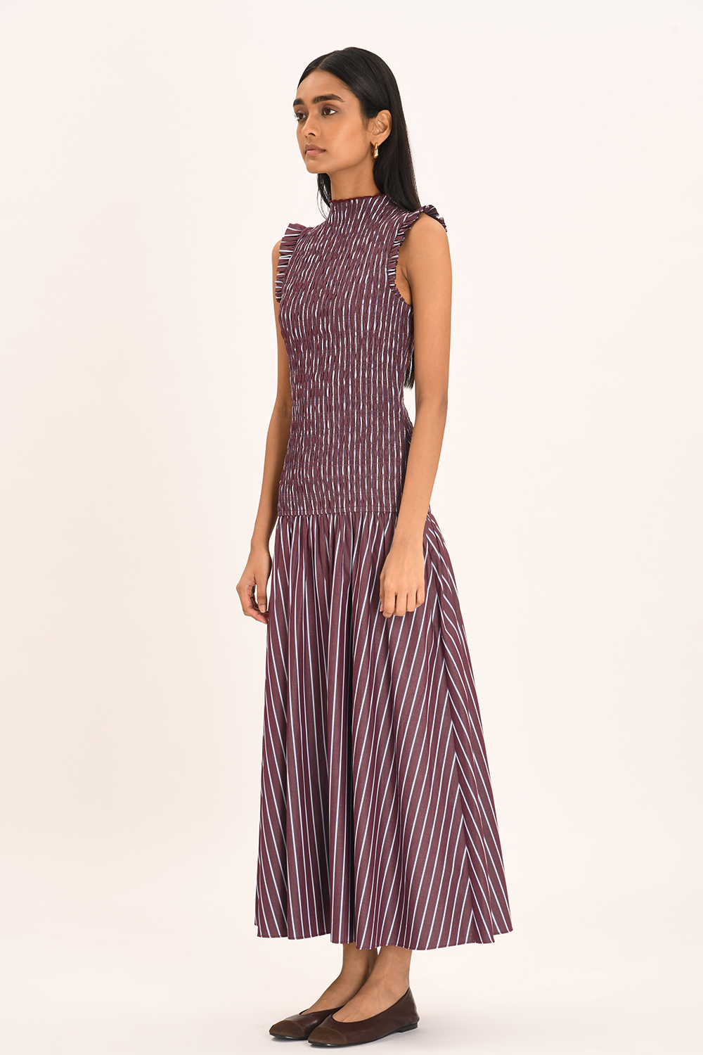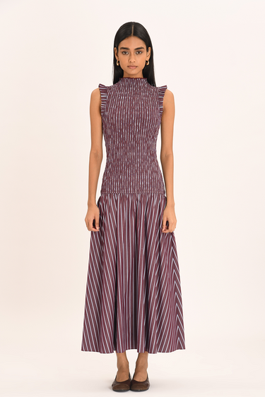 Introducing the Gabrielle dress in Merlot Stripe. The sleeveless silhouette features frill-lined armholes and a gentle high neckline. Fitted through the bodice with a softly structured smock, it falls into a voluminous skirt from the drop waist — a quietly poised piece for everyday elegance.