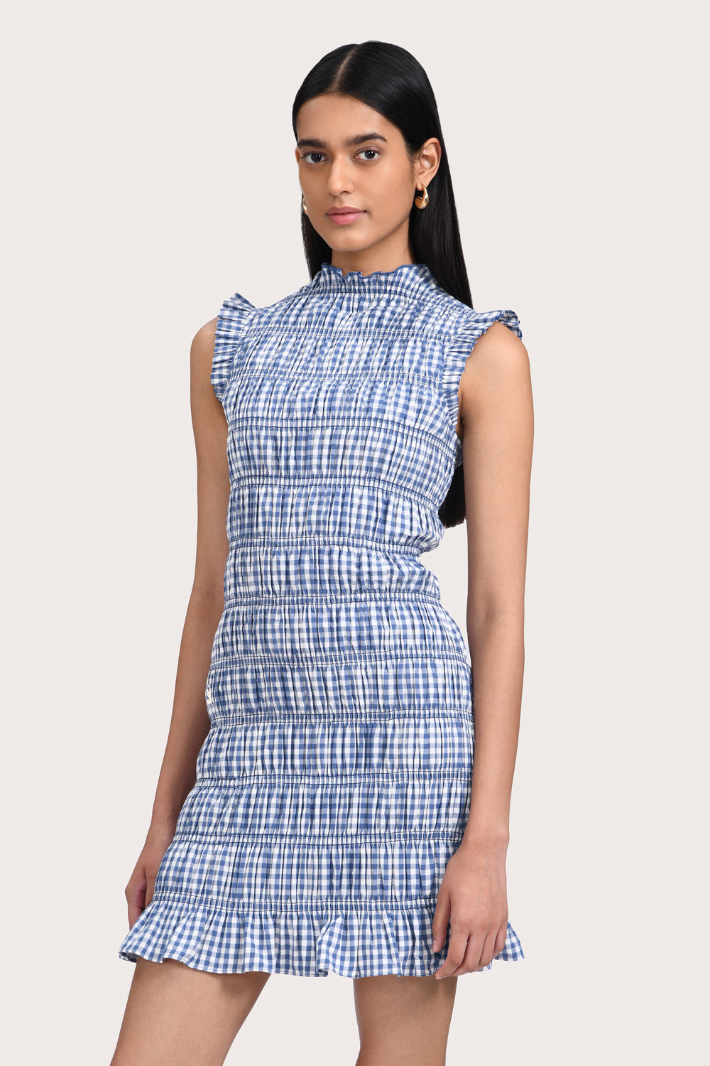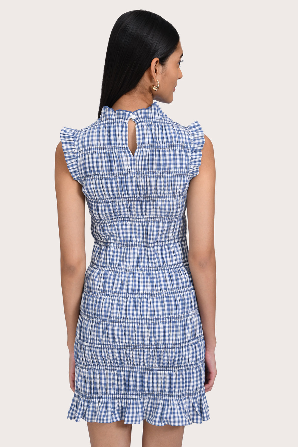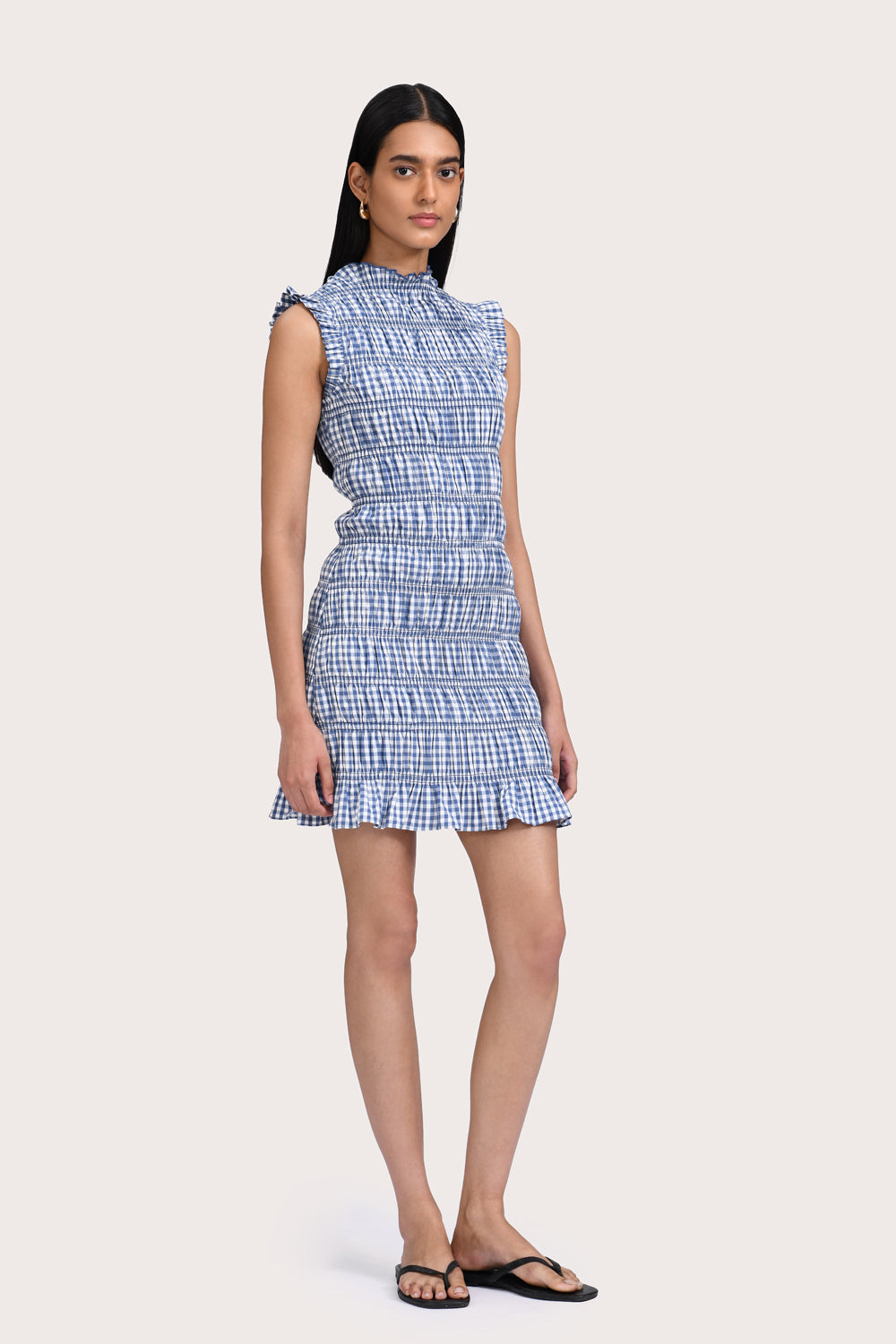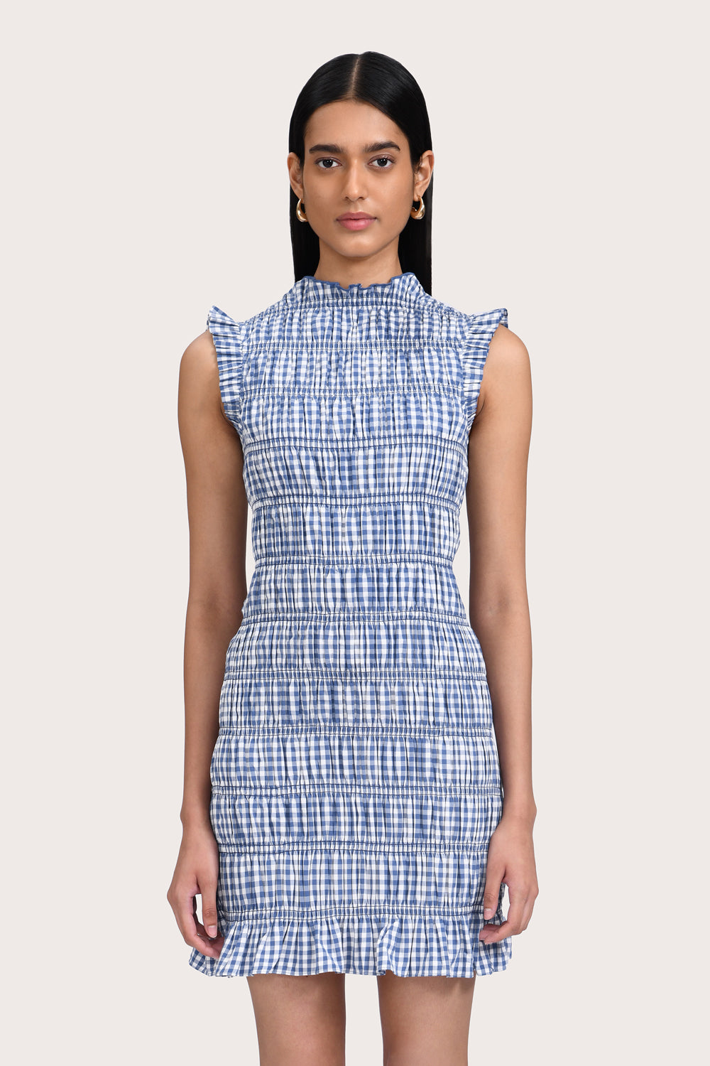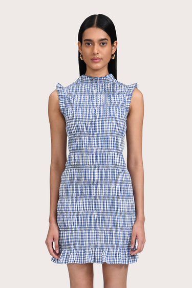 The Liliana Mini Dress in Blue Gingham is a playful mini dress crafted in 100% cotton. It features an all-over shirred body, with frill details at the hem and shoulder. Designed for warm days and relaxed ease, it works perfectly with a sandal to take you from day to night.