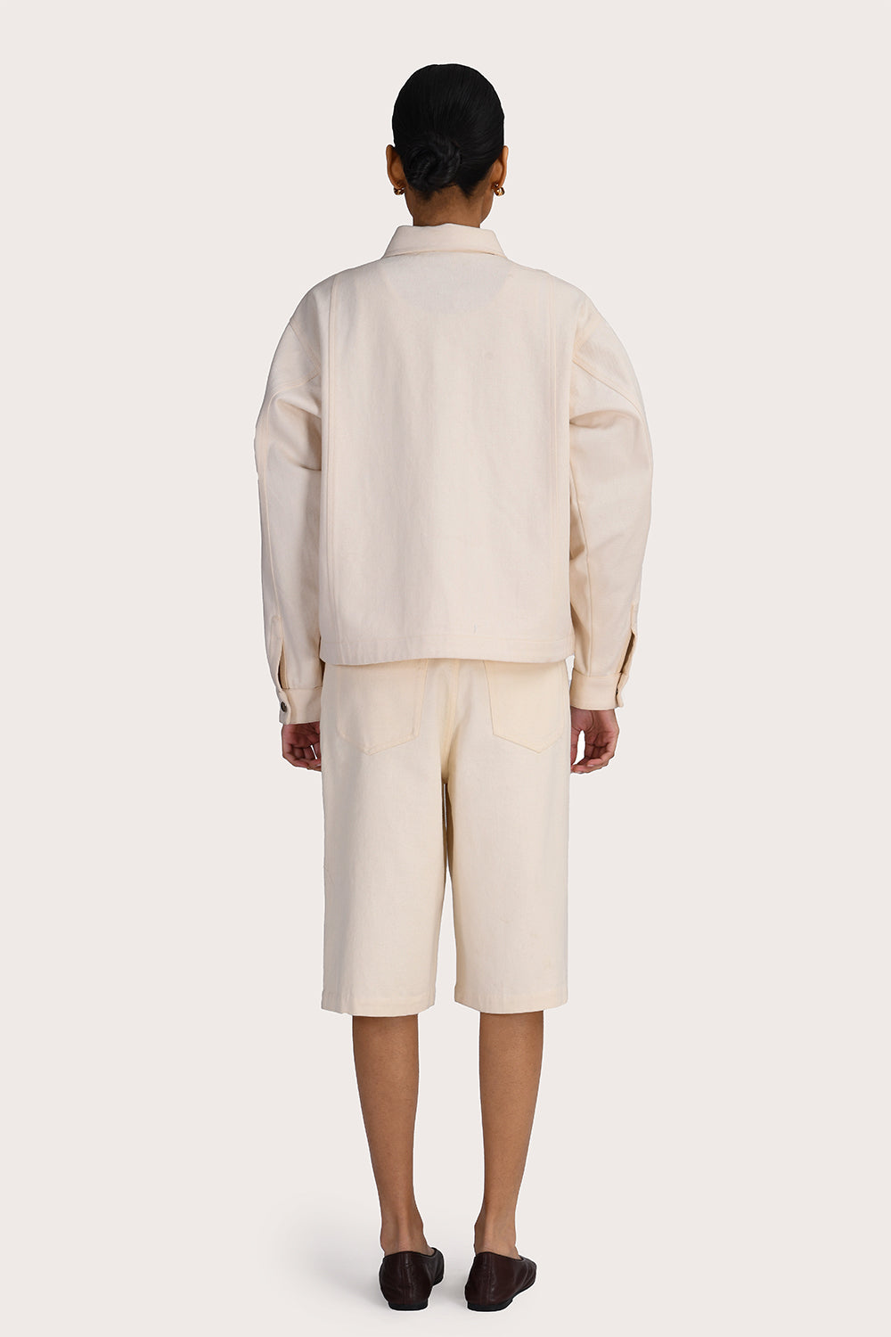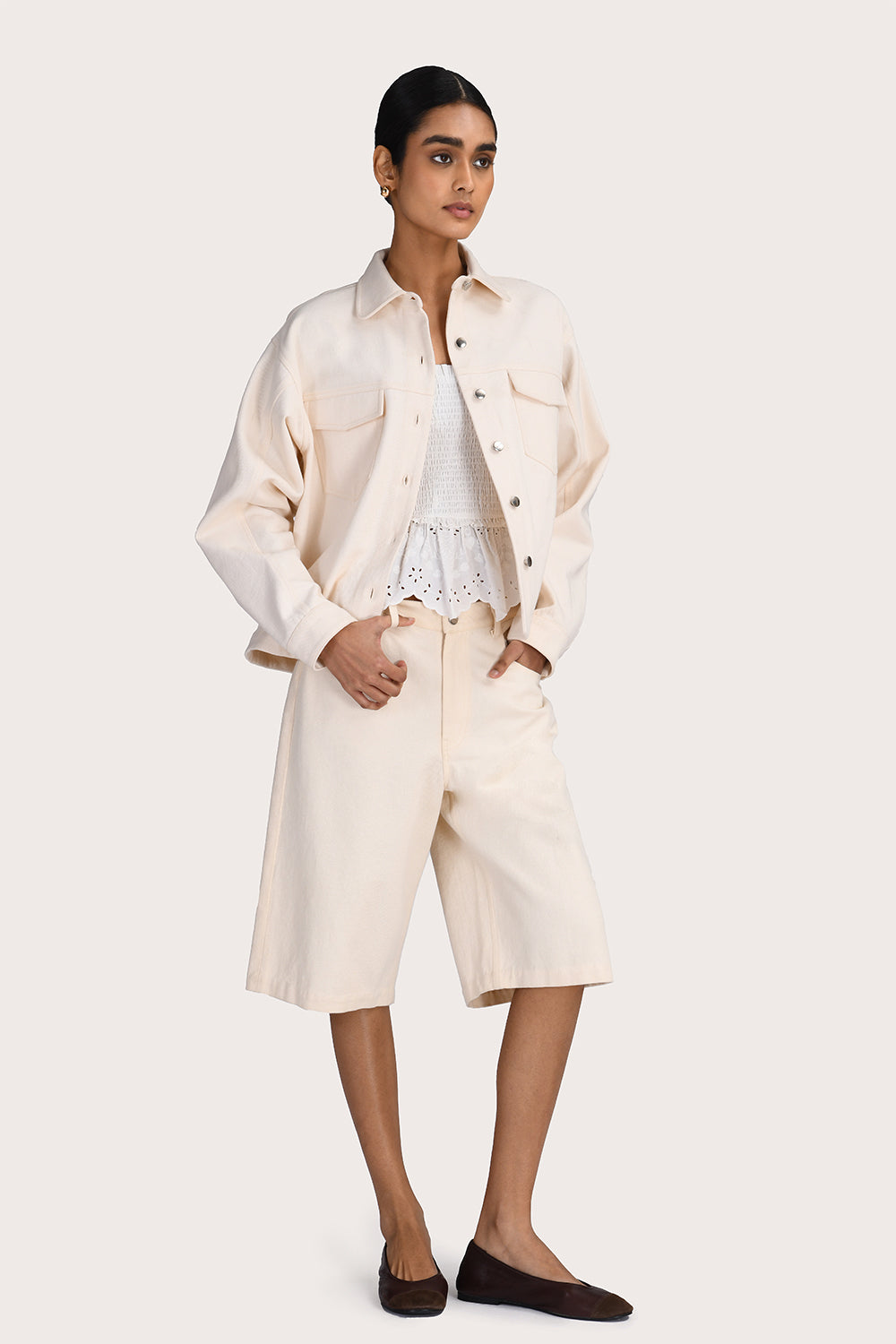 The Roxana Shorts in Ecru offer a modern silhouette with a knee-length, relaxed fit. Crafted from structured 100% cotton twill, they feature functional side and back pockets, belt loops, and a classic zip and button closure. Coordinate with the matching Roxana Jacket or with your favourite tee.
