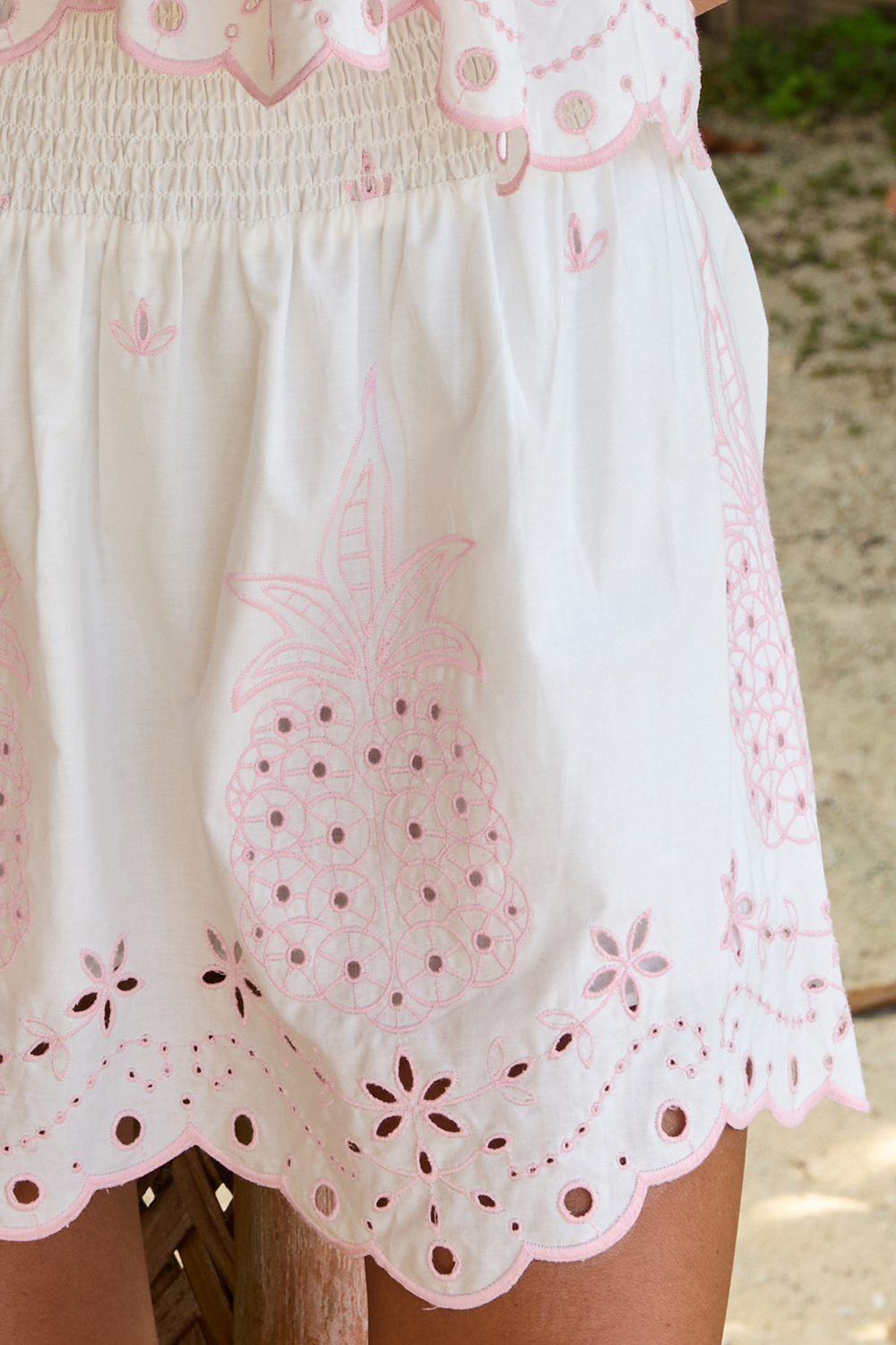 Our Eden skirt is a mini crafted in 100% cotton. It features an elasticised waistband and a flattering scalloped hem. Finished in a crisp white with pink embroidery, it layers effortlessly with the matching Eden Cami, or your fave white tee.
