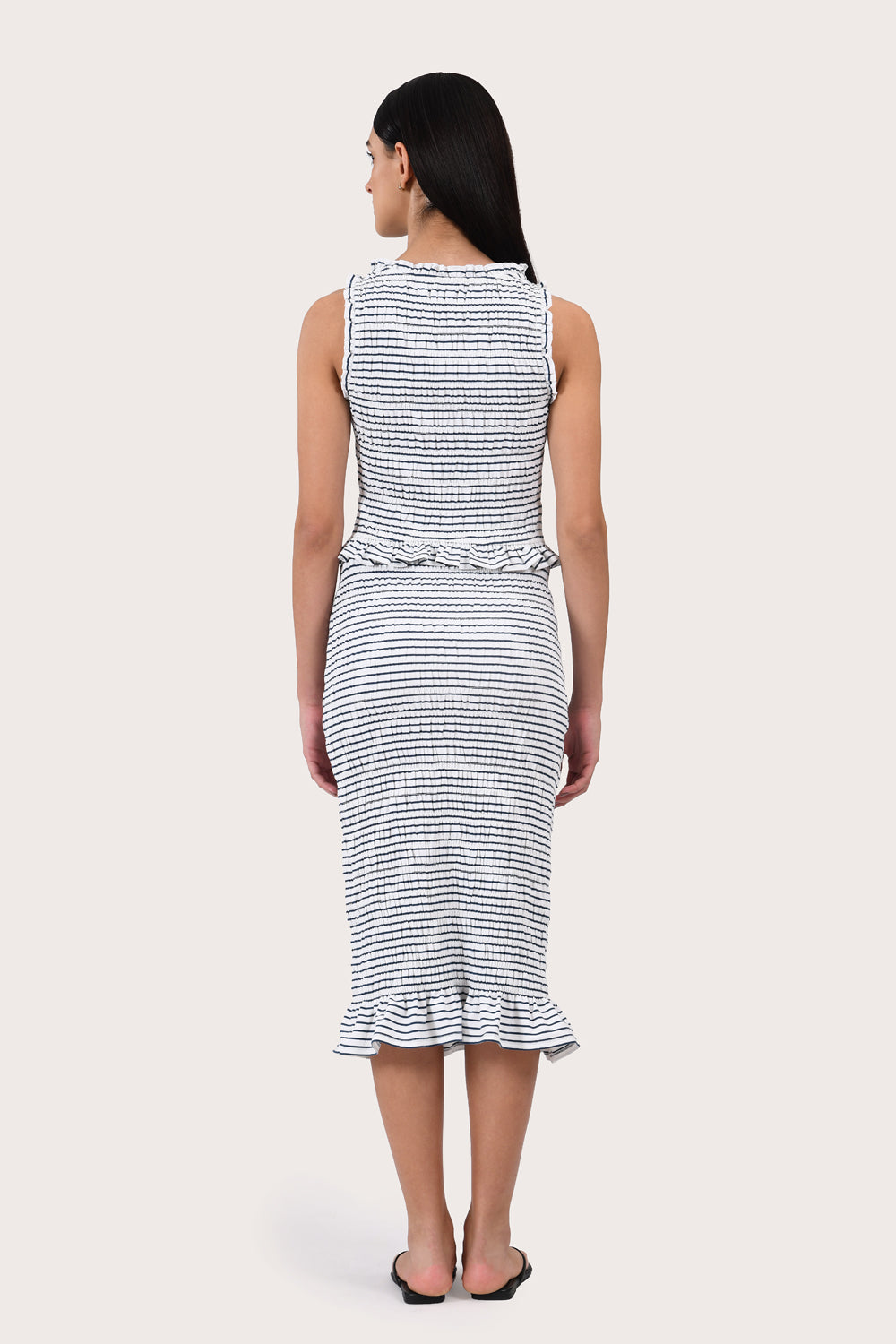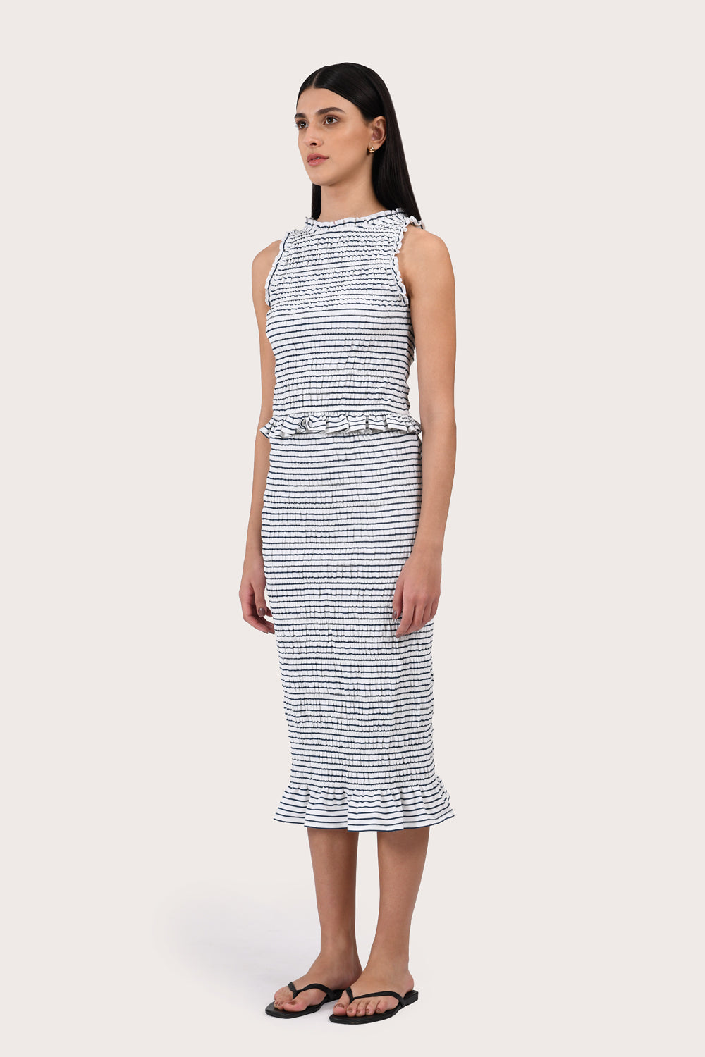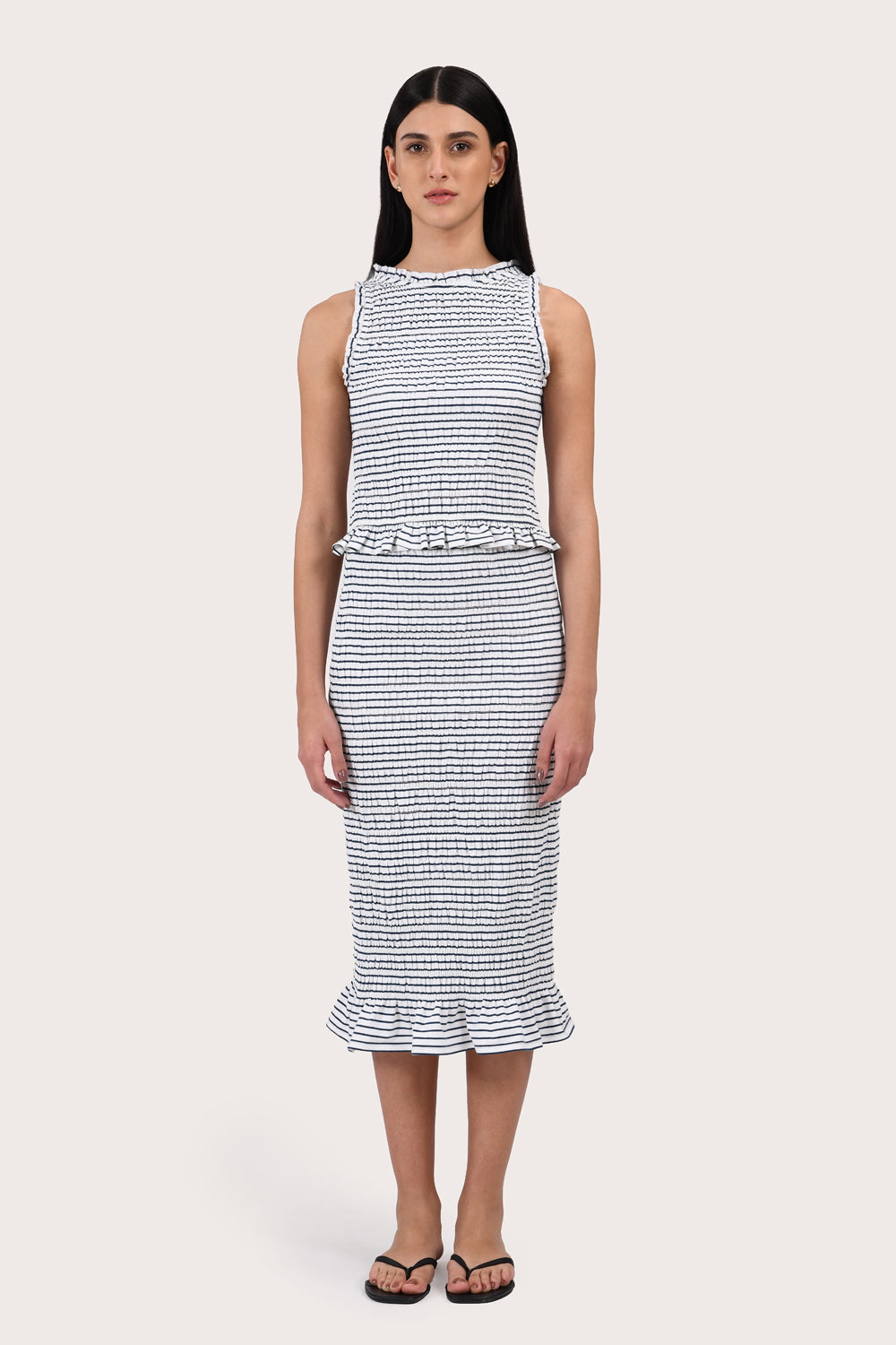 The Mara Skirt in Navy Stripe is a slip-on midi crafted from soft, breathable cotton jersey. Unlined with an elasticated waistband, it skims the body for a relaxed silhouette. Style with the matching Mara Top for summer set dressing.