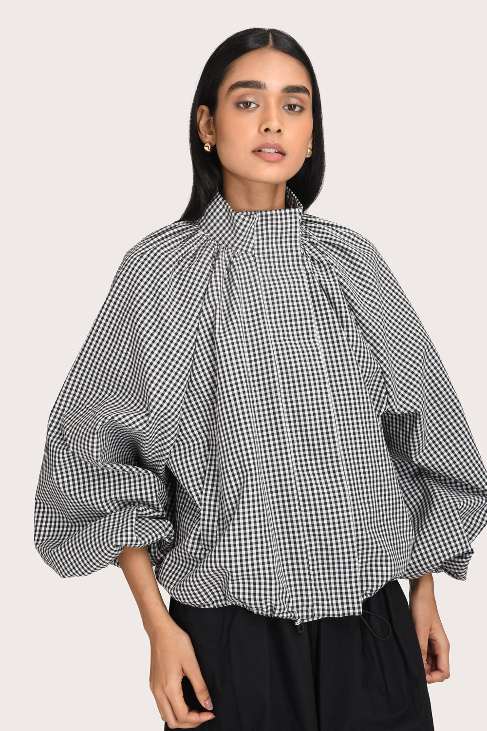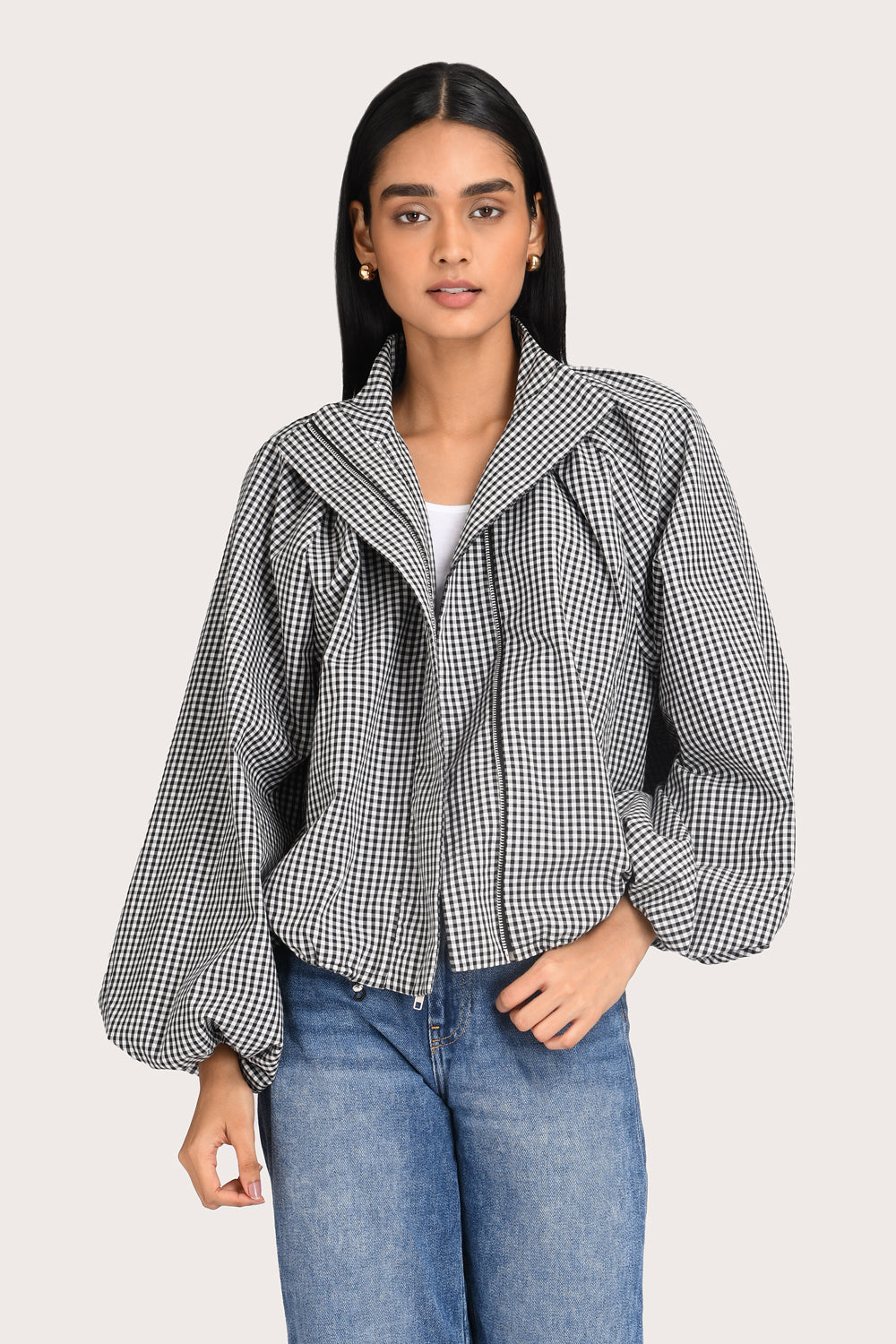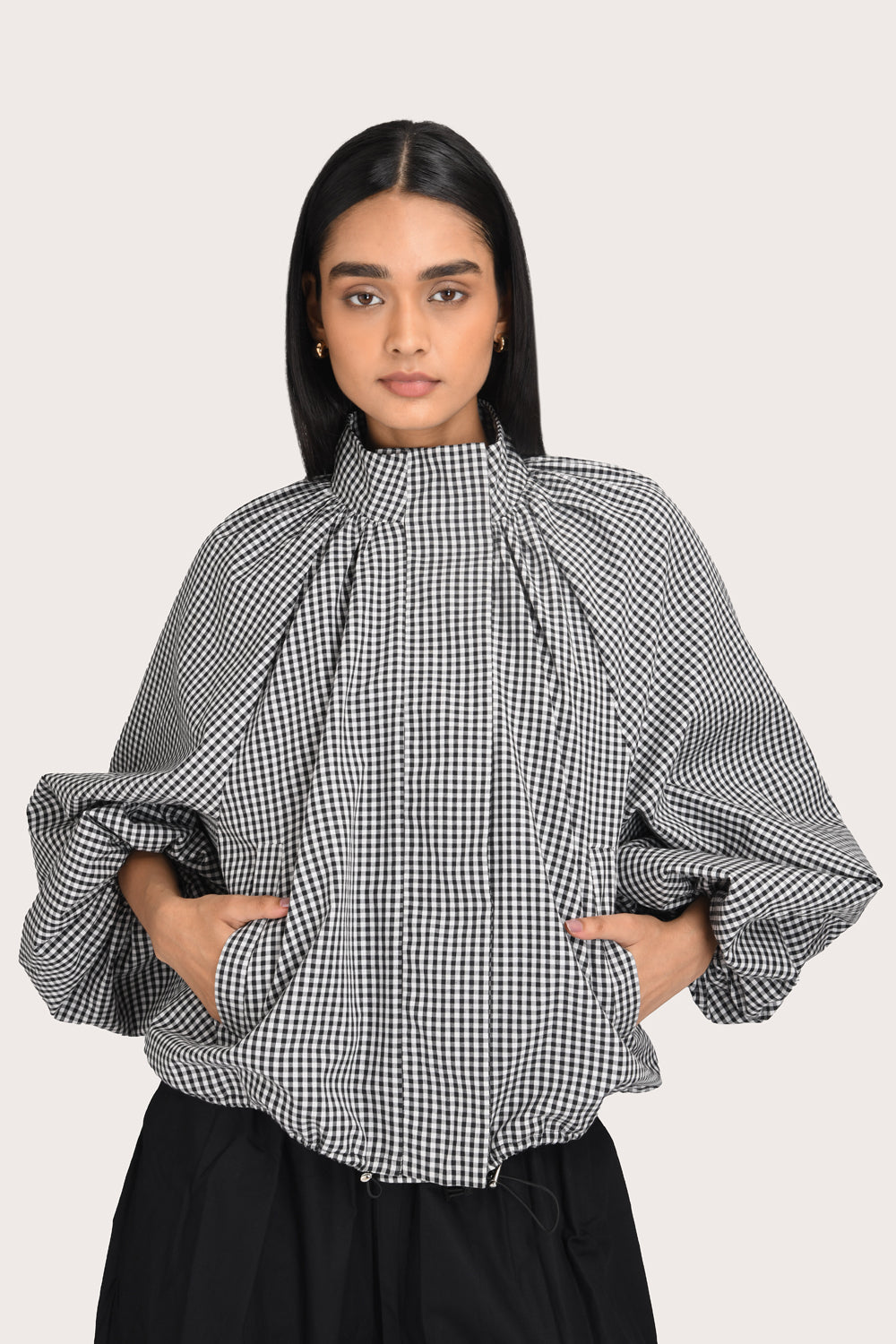 A modern take on seasonal layering, the Evelyn Jacket in Noir Gingham features a funnel neck, functional side pockets and voluminous balloon sleeves. This style is designed with a zip-front closure and an elasticated hem to create a contemporary, cropped silhouette. Style it with high-waisted trousers or your favourite denim for a statement look.