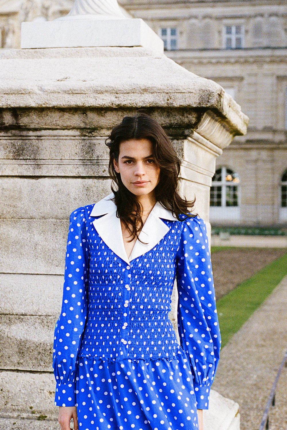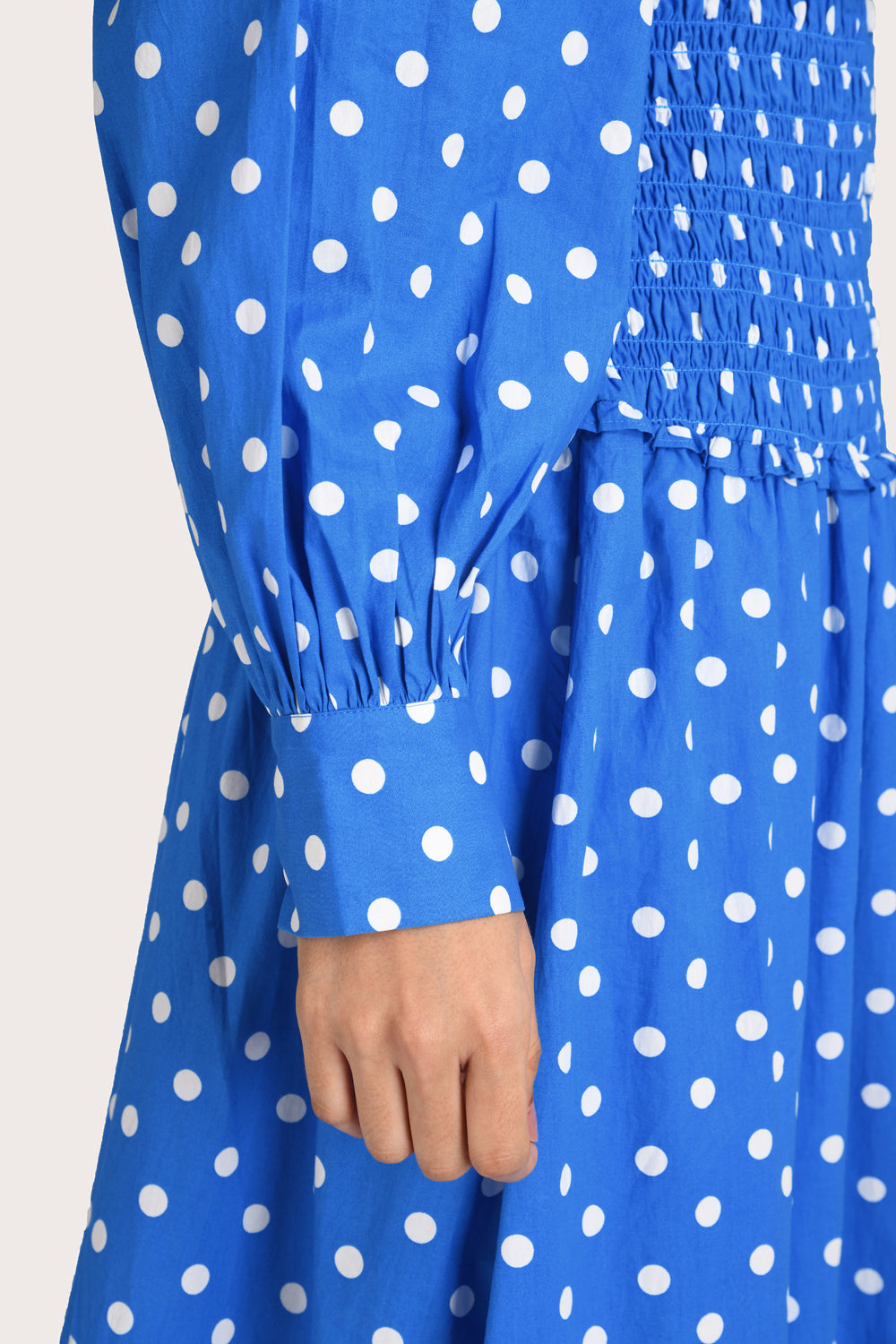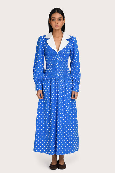 A confident silhouette for the season, the Jemma Dress features our blue polka print with a contrast collar and button-down smocked bodice. Cut with long sleeves and a fluid midi skirt, it moves effortlessly from weekday to weekend. Wear with your favourite flats, or elevate with a heel for your next event.