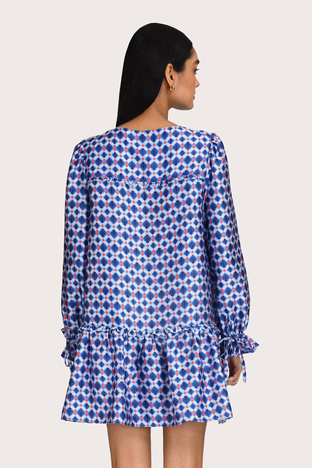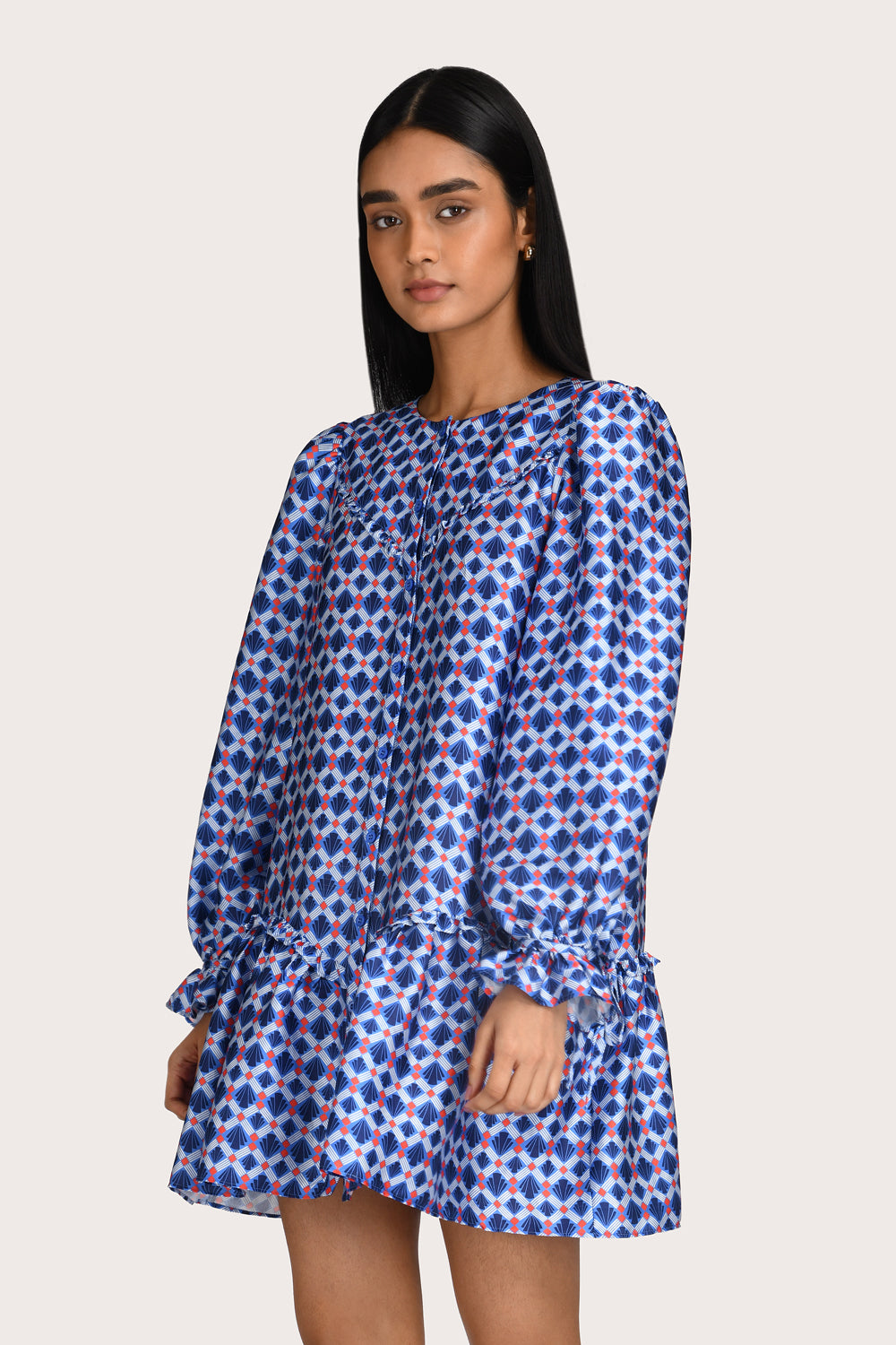 Capturing a playful yet refined mood, the Mae Mini Dress in Sapphire is designed with a softly elevated neckline and statement long sleeves, finished with delicate ruffle detailing. The silhouette falls into an effortless shift shape, balancing subtle volume with a flattering, short hemline. Style it with boots or a ballet flat for a polished look that transitions seamlessly from day to night.