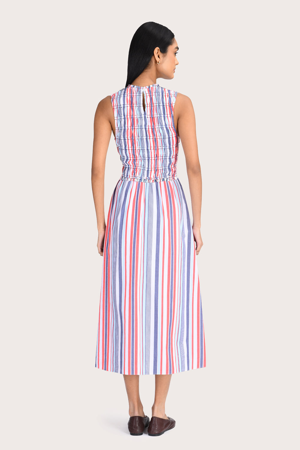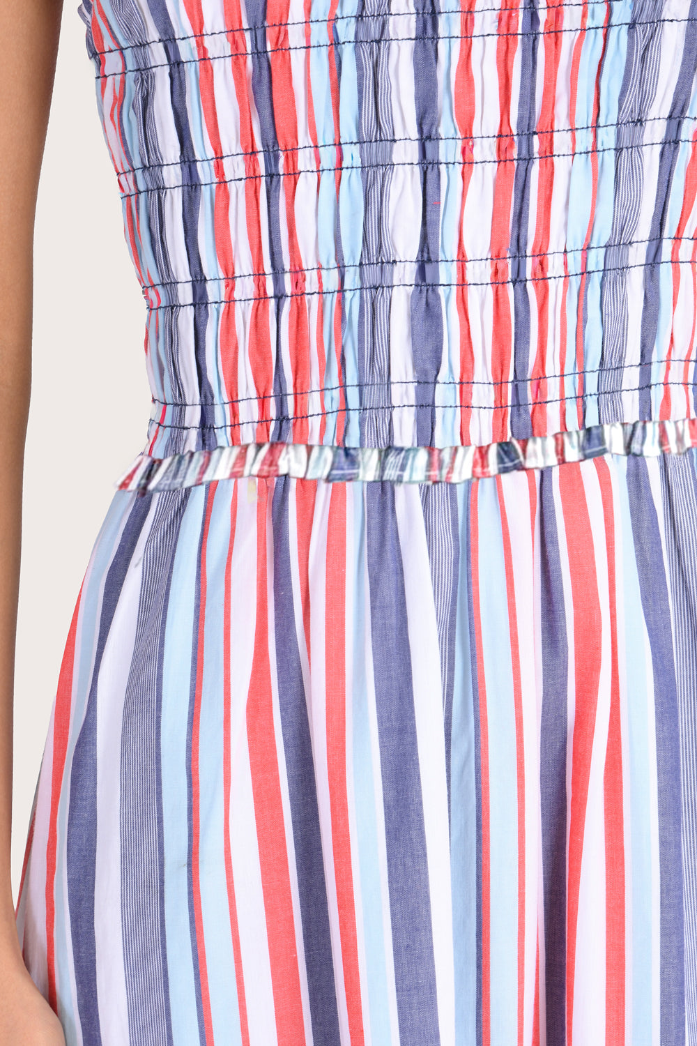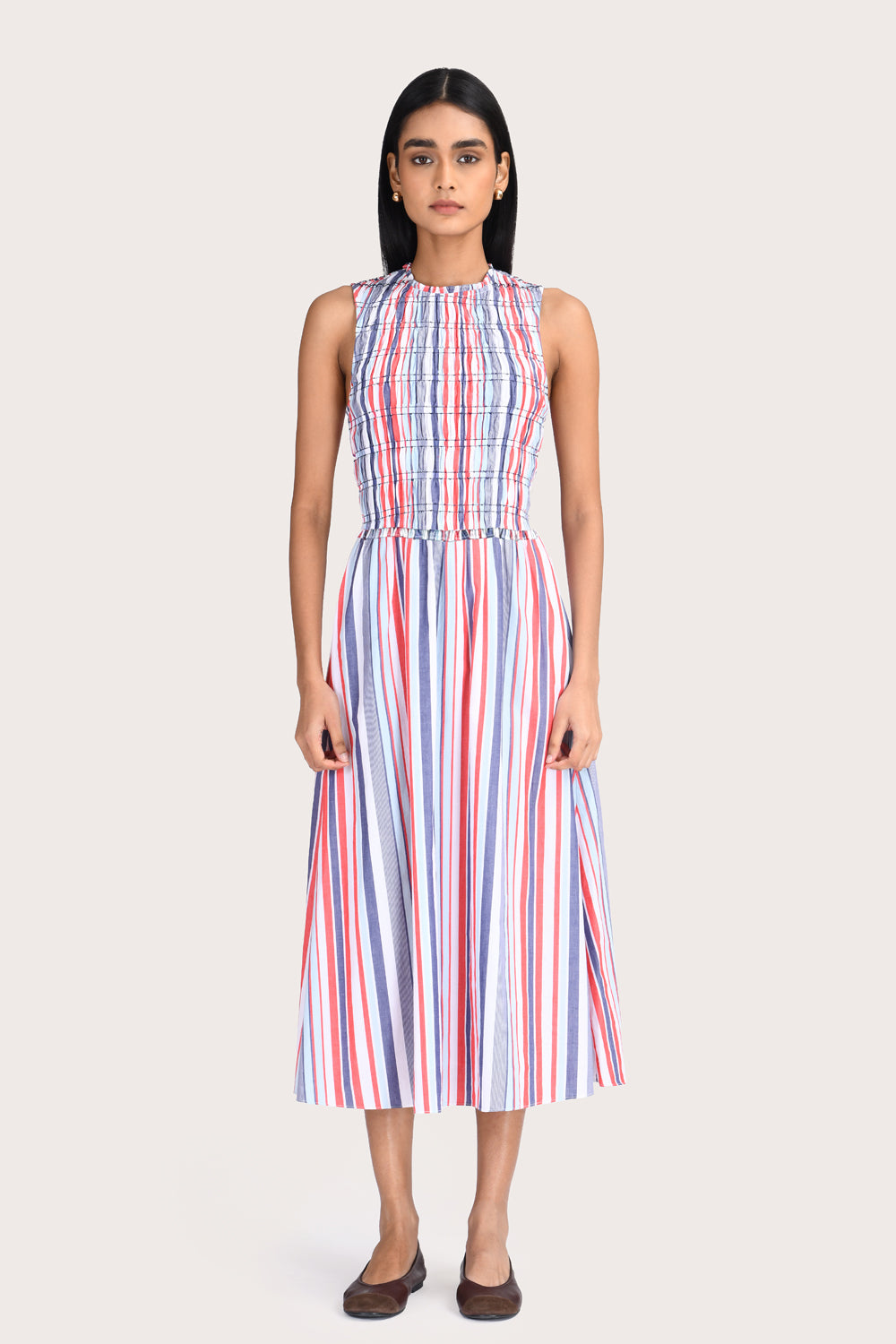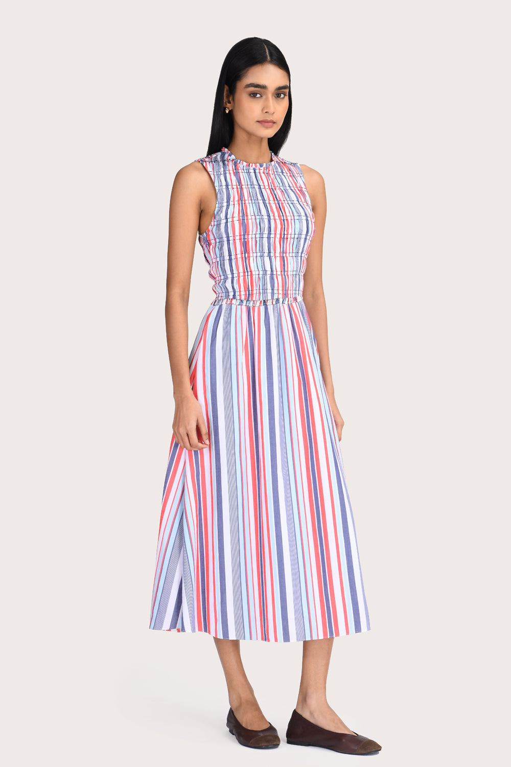 Chic yet feminine, the Sophia Dress is a midi-length silhouette featuring a flattering smocked bodice for added stretch. Design details include a delicate frill at the neck and a soft A-line skirt, fully lined in cotton voile for comfort. Style with sandals for weekend brunch or heels for your next event.