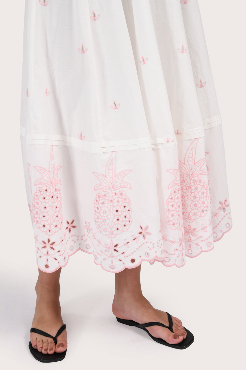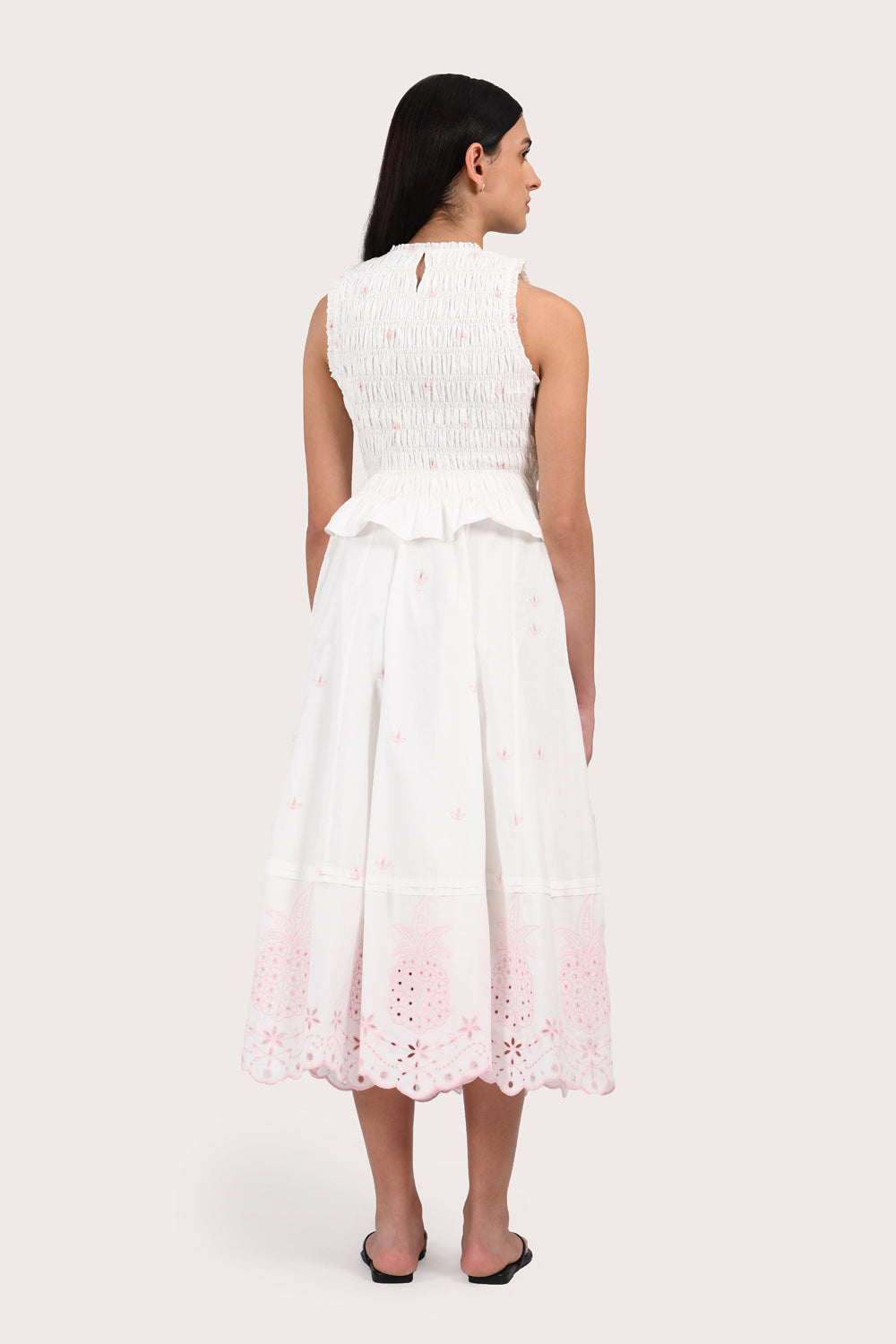 The Alice Skirt in White is a refined midi featuring delicate broderie detailing and a scalloped hem. Fully lined in cotton poplin, it sits high on the waist with a side zip closure. Pair with the Alice Top for a coordinated, feminine ensemble.