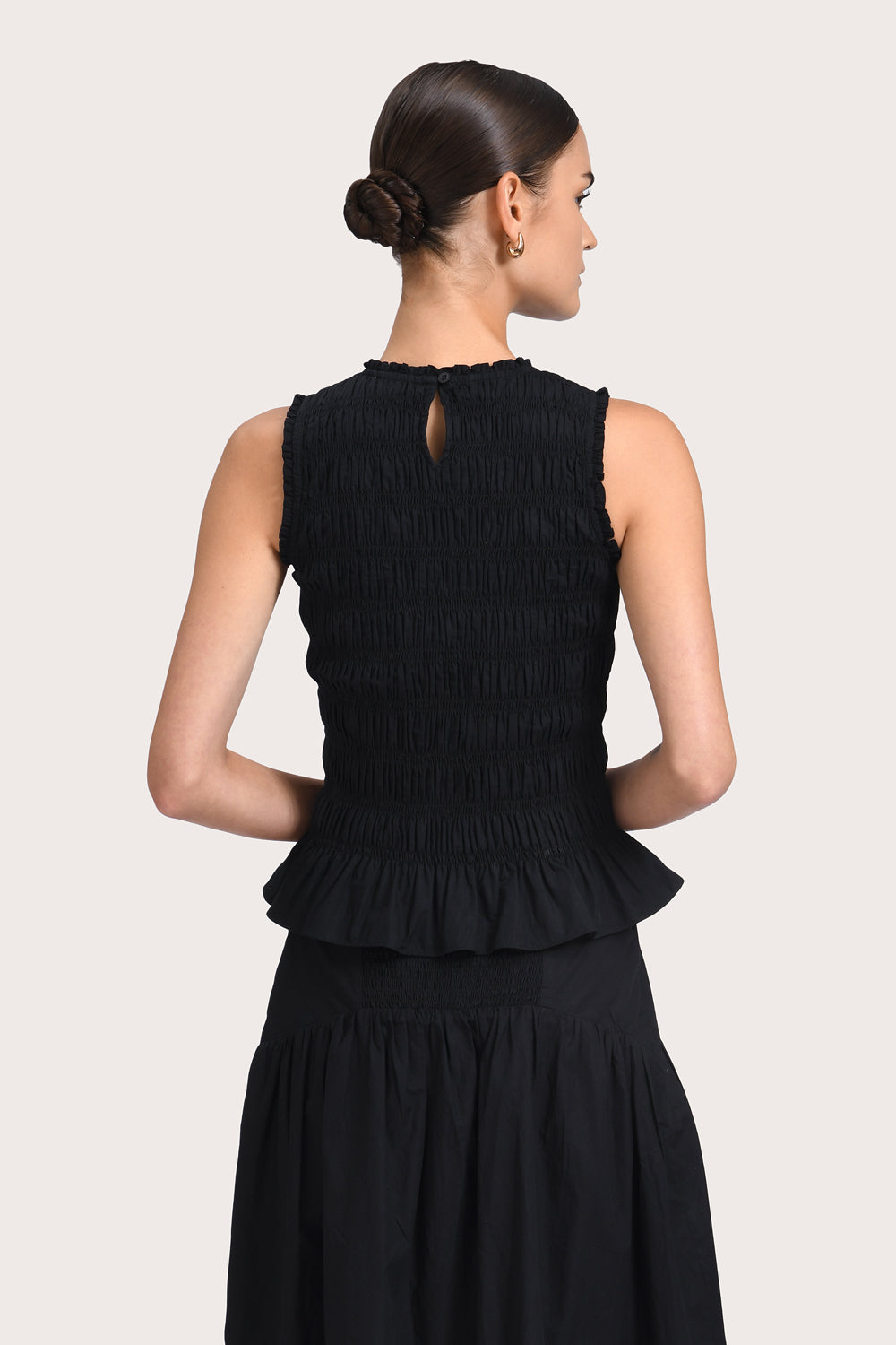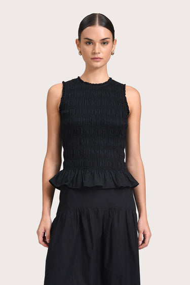 The Marsielle top in Noir is an elevated essential to add to your forever wardrobe. Crafted from soft 100% cotton, its fully smocked bodice offers a comfortable, close fit, while the sleeveless cut and frill hem add a feminine feel. It pairs perfectly with the matching Lottie Short or your favourite bottoms.