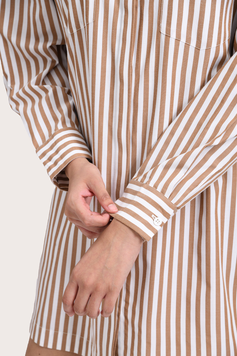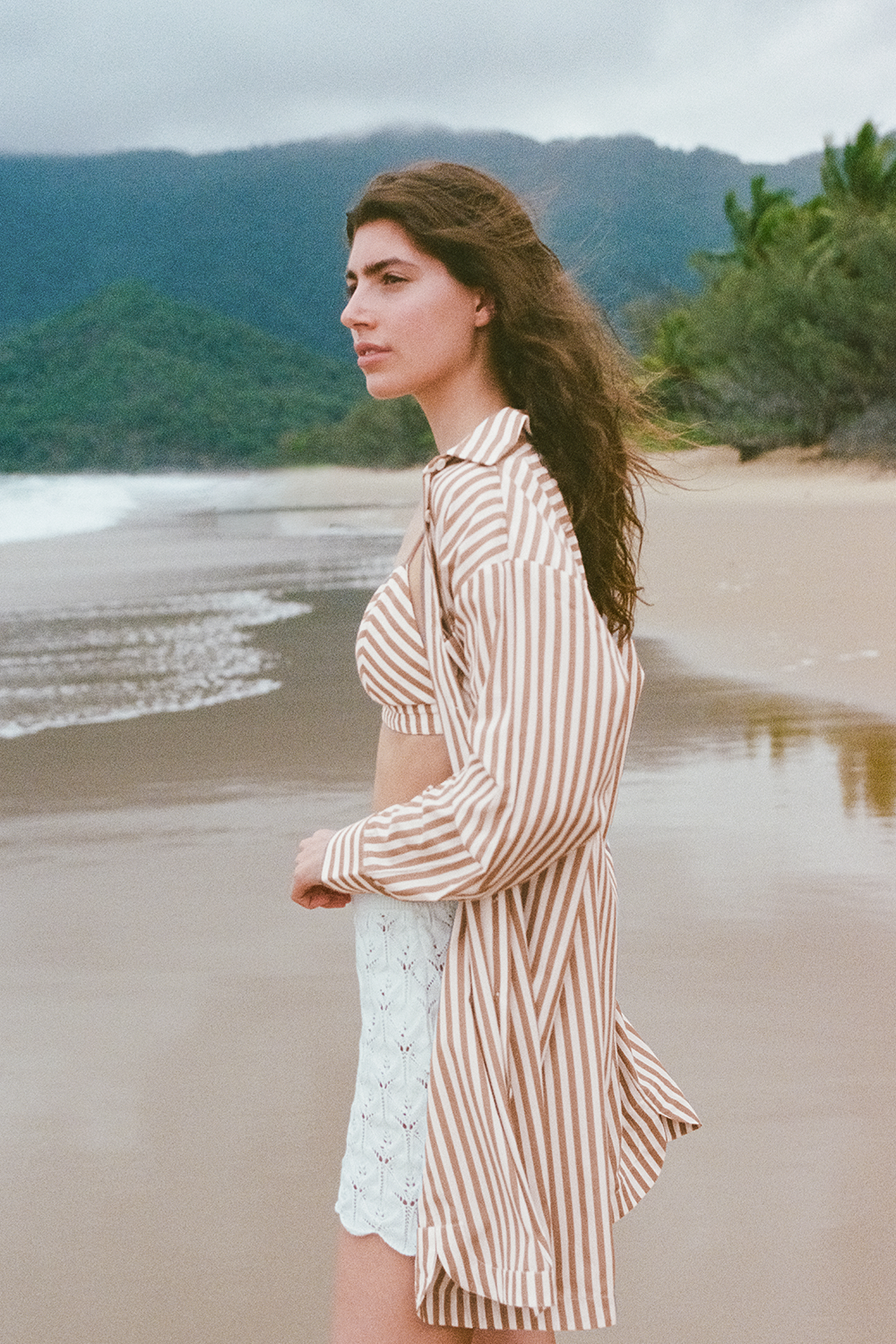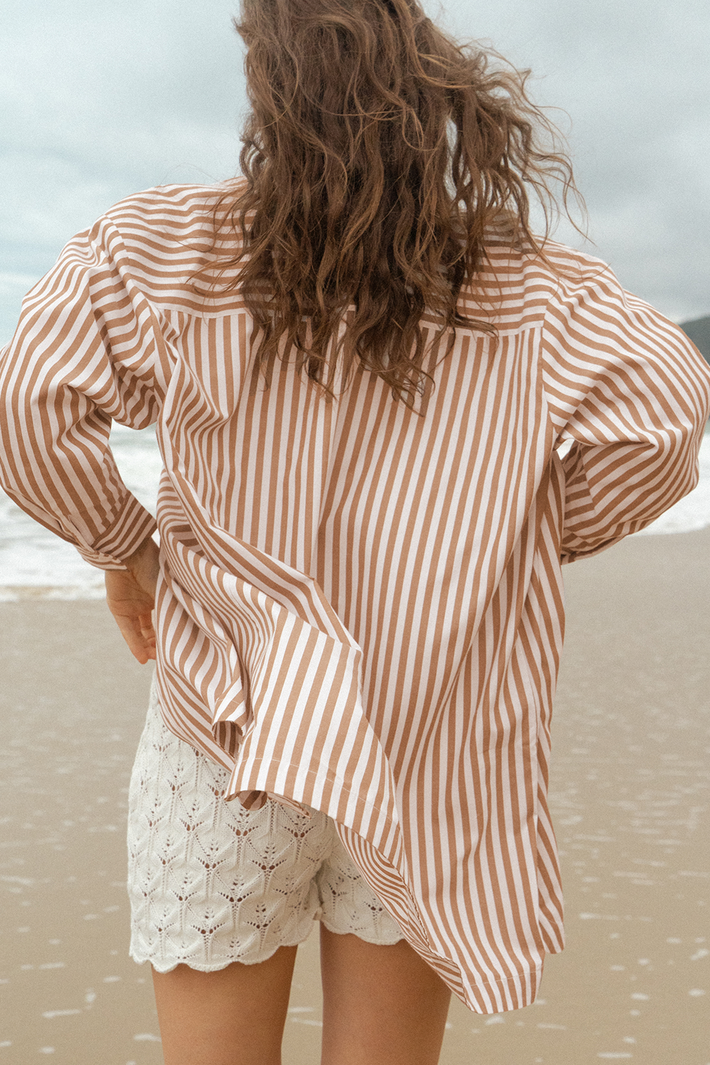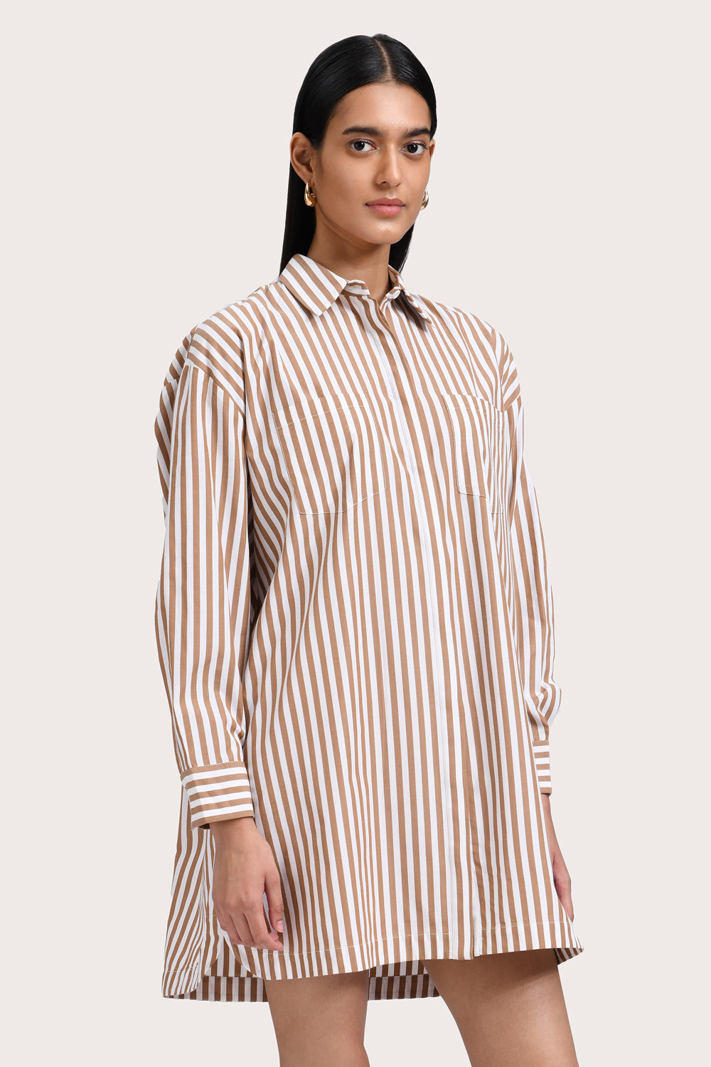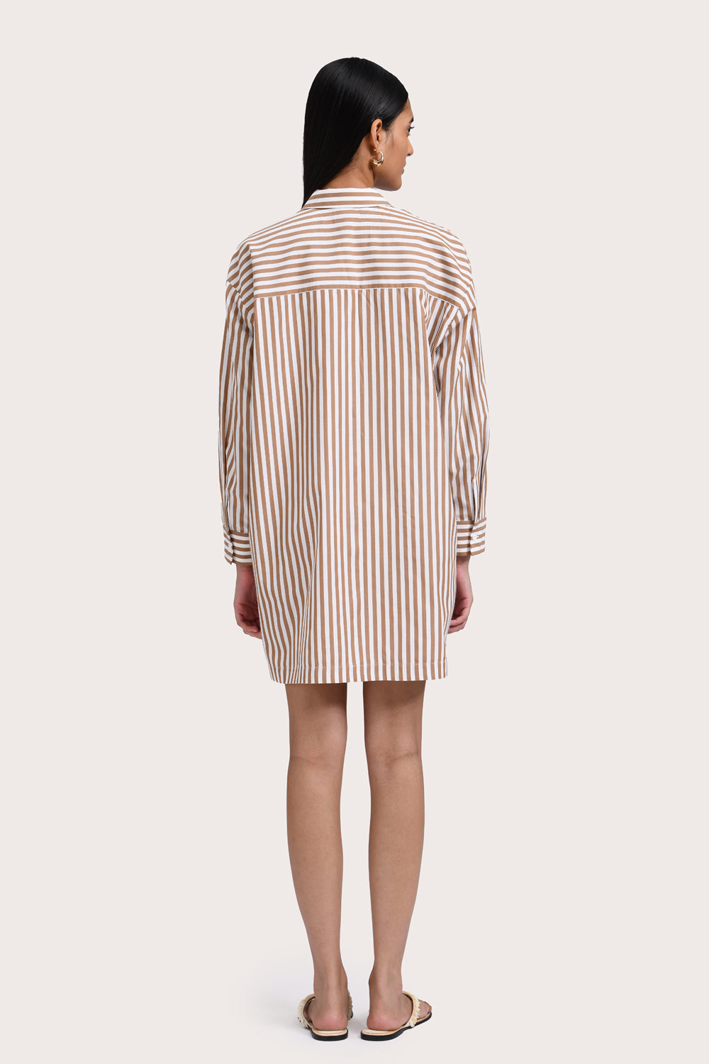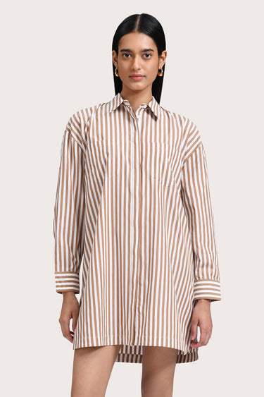 An effortless shirt-style mini, the Maribel Dress in Neutre Stripe is perfect for warm-weather days. It features a relaxed fit with a full button-down front, functional side pockets, and a soft, curved hem. Just add your favourite sandals for elevated everyday dressing.