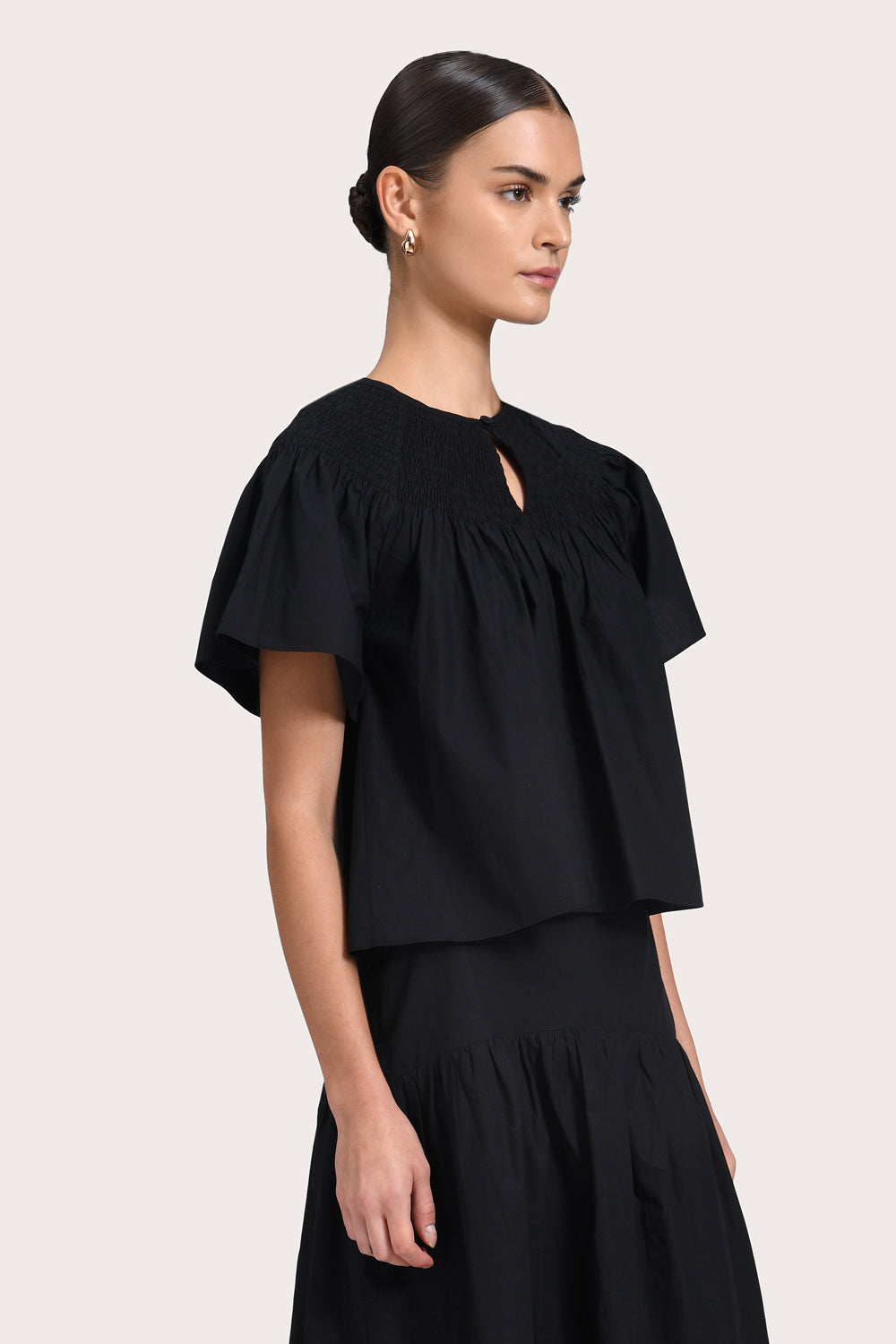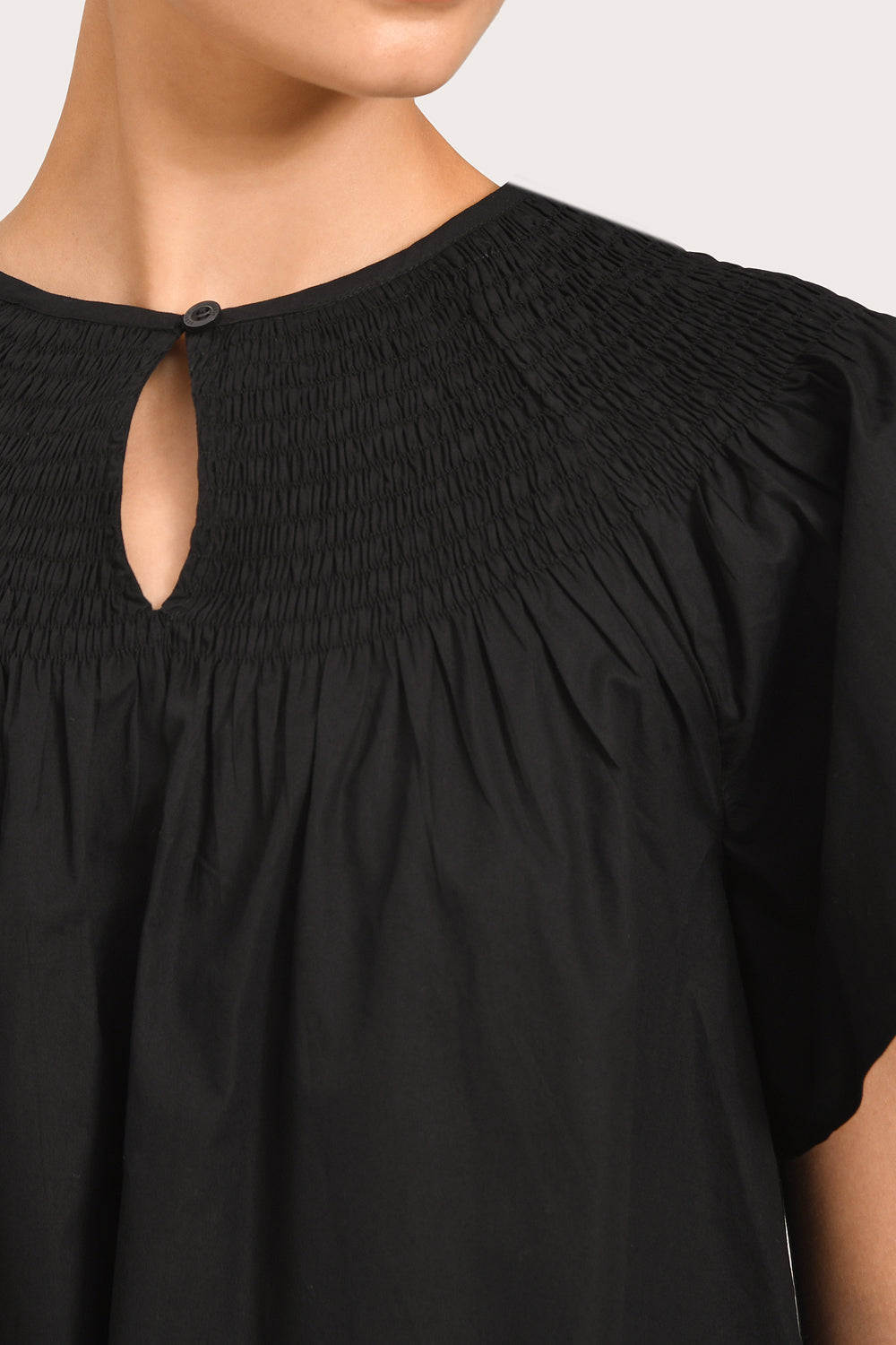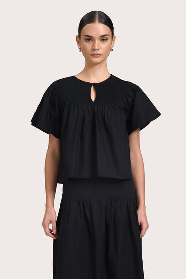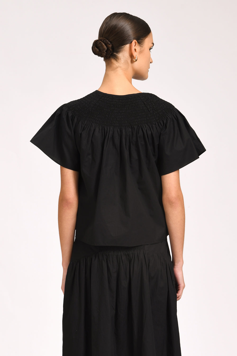 An elevated essential, the Remi Blouse in Noir is designed in a relaxed, feminine silhouette. It features a smocked yoke around the round neckline, a simple front button enclosure, and floaty half-length sleeves. Pair with the matching Mathilde Skirt or Lottie short for elegant everyday styling.