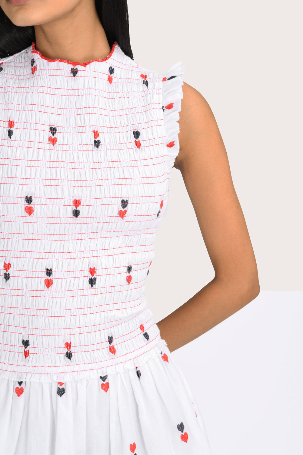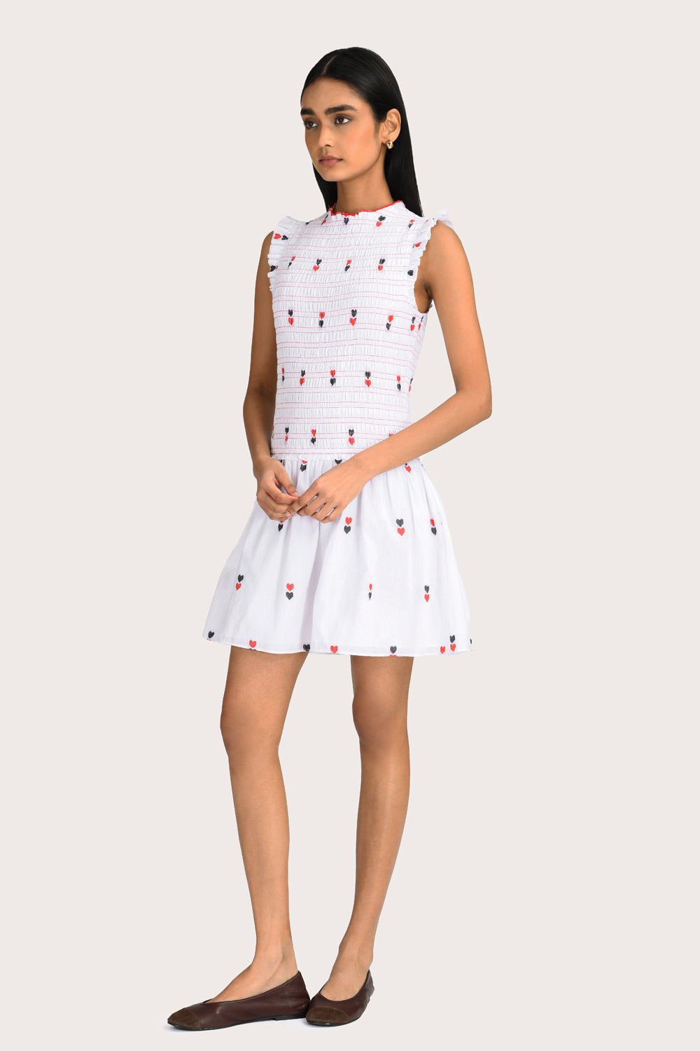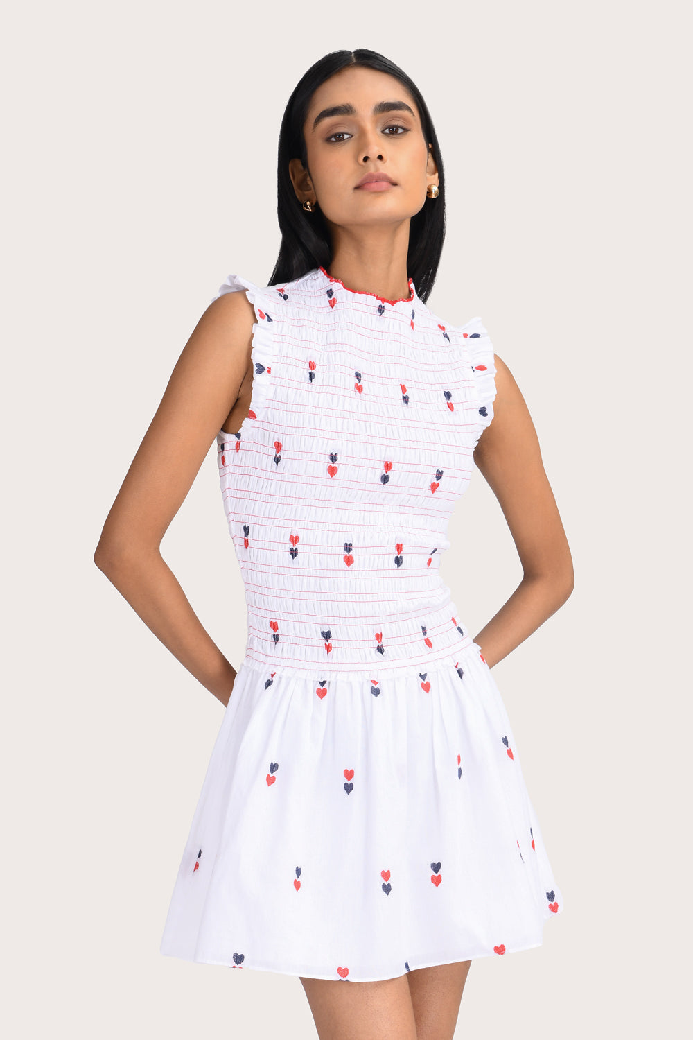 The Raffaella Mini Dress in White offers a modern, relaxed silhouette with a high neck and drop waist. Crafted from 100% cotton poplin, this lined style features a fully smocked bodice for added stretch and delicate double heart detailing throughout. Style with sandals for a polished everyday look.