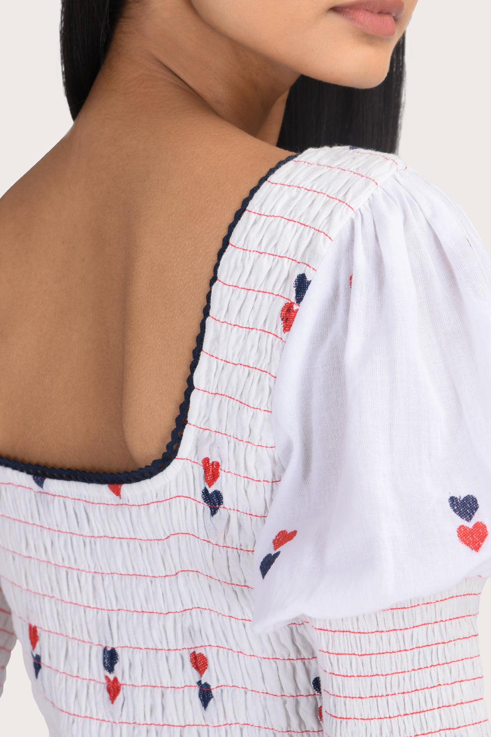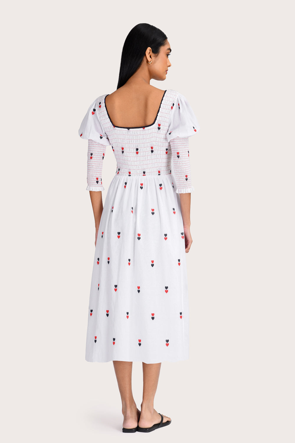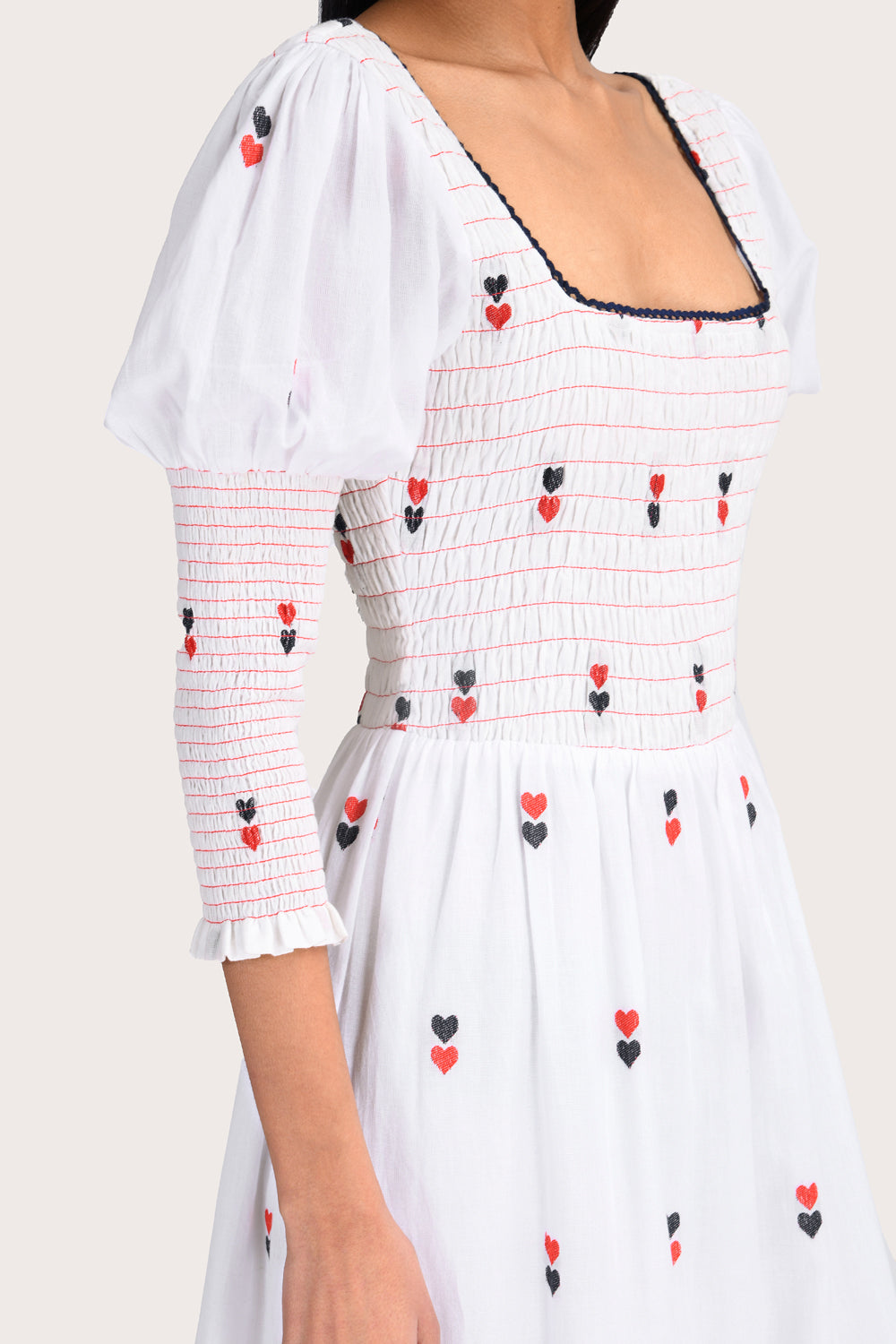 The Selene Midi Dress in White is a timeless slip-on style featuring a square neckline and puff half sleeves. Designed in 100% cotton with a fully smocked bodice and frill detailing, this midi-to-ankle-length dress features delicate double heart detailing. Its timeless silhouette makes it a versatile choice for all occasions.