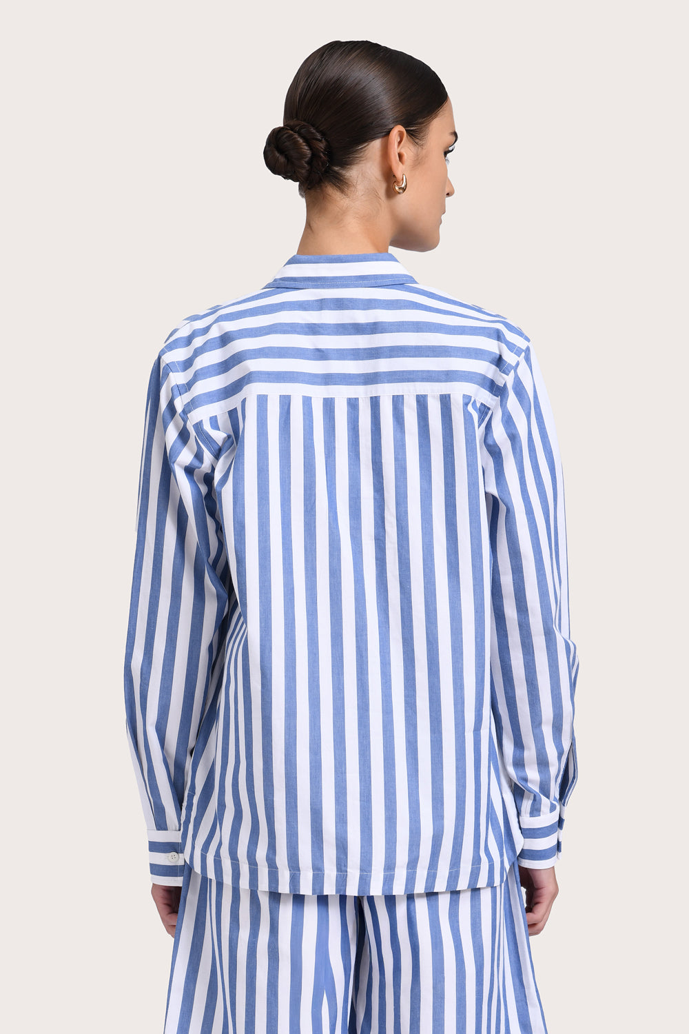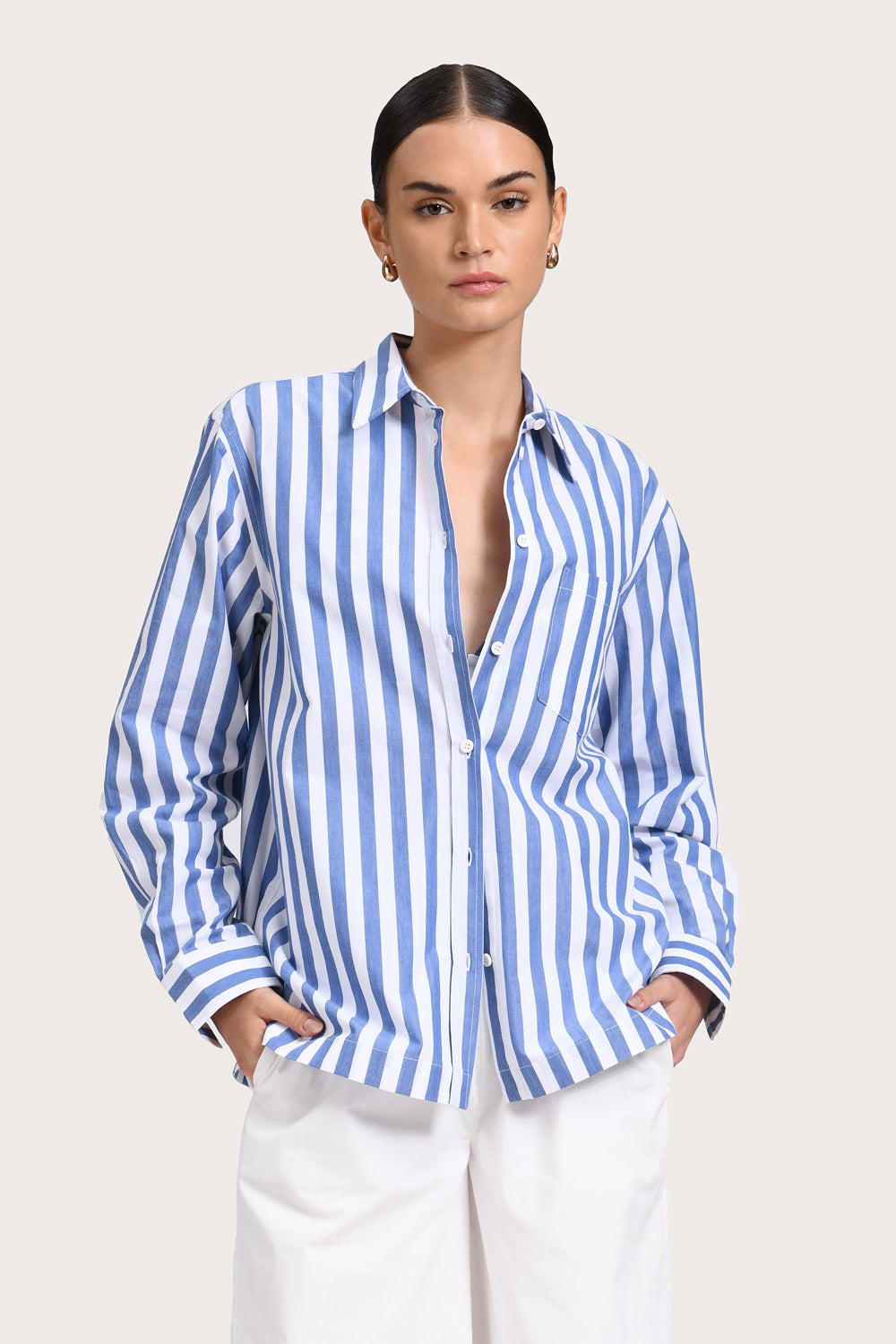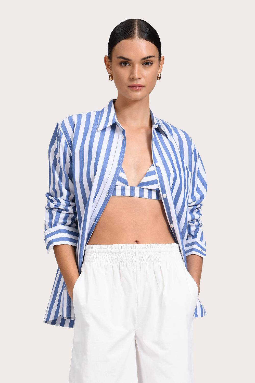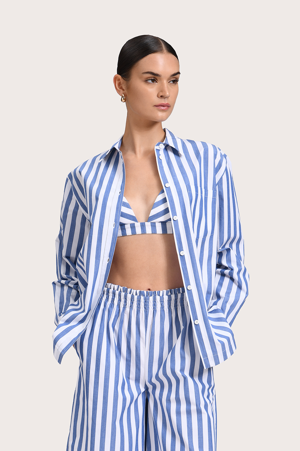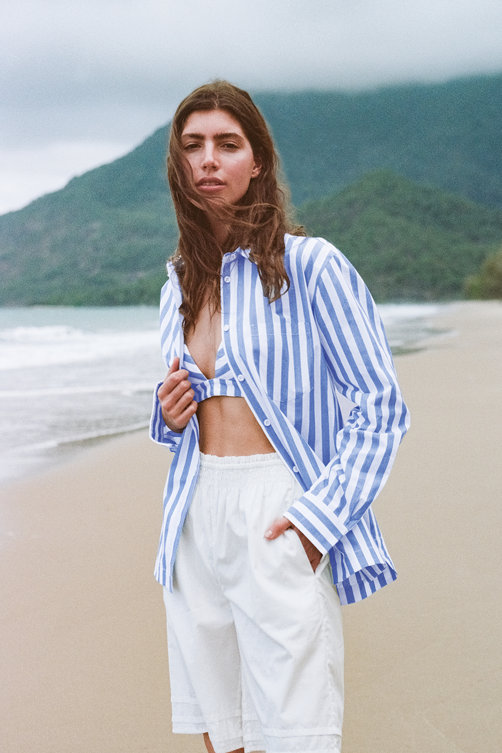 A timeless shirt for your forever wardrobe, the Nathalie in Amalfie Stripe is designed for an easy, relaxed fit. Crafted from 100% cotton, it features a full button-down front and a classic chest pocket. Wear it buttoned up or open as a light layer over the Joelle Bralette.