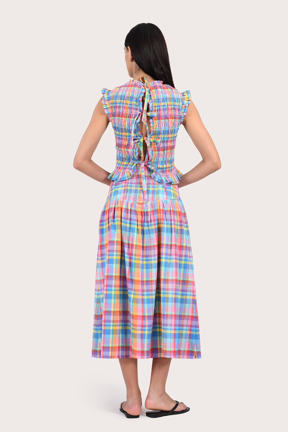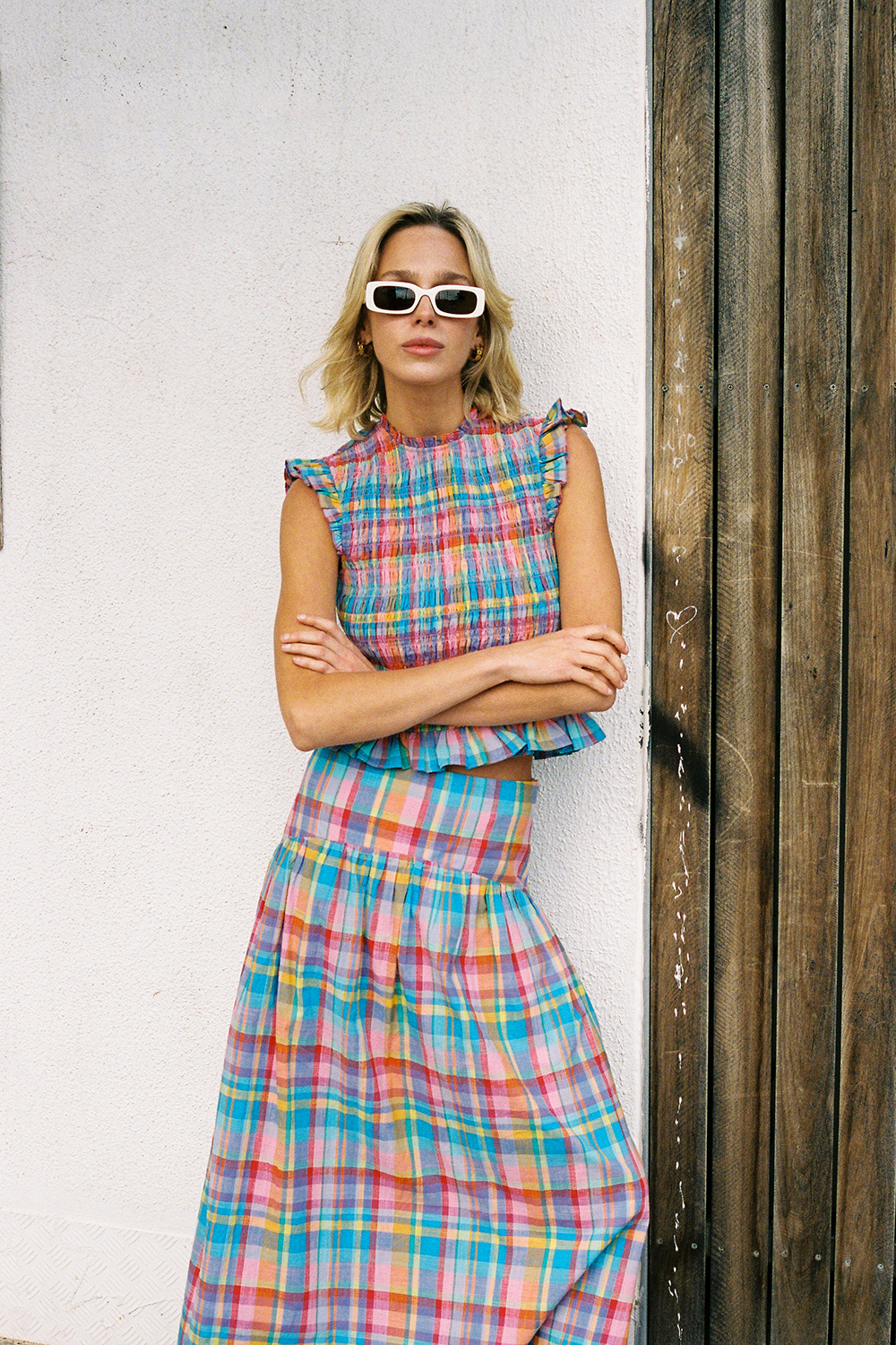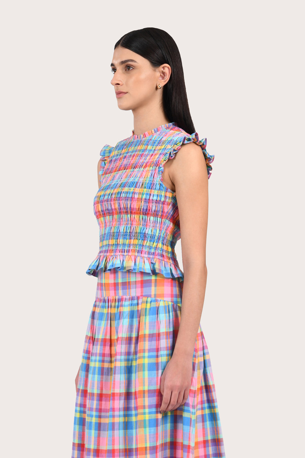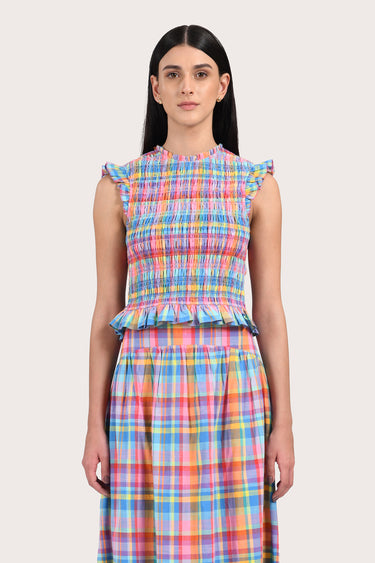 The Coco Top in Rainbow Check is a playful addition to your summer wardrobe. Crafted from soft 100% cotton, it's fully smocked bodice offers a comfortable, close fit, while the sleeveless cut and frill hem add a feminine feel. It pairs perfectly with the matching Catia skirt for effortless set dressing.