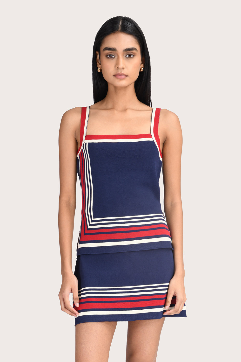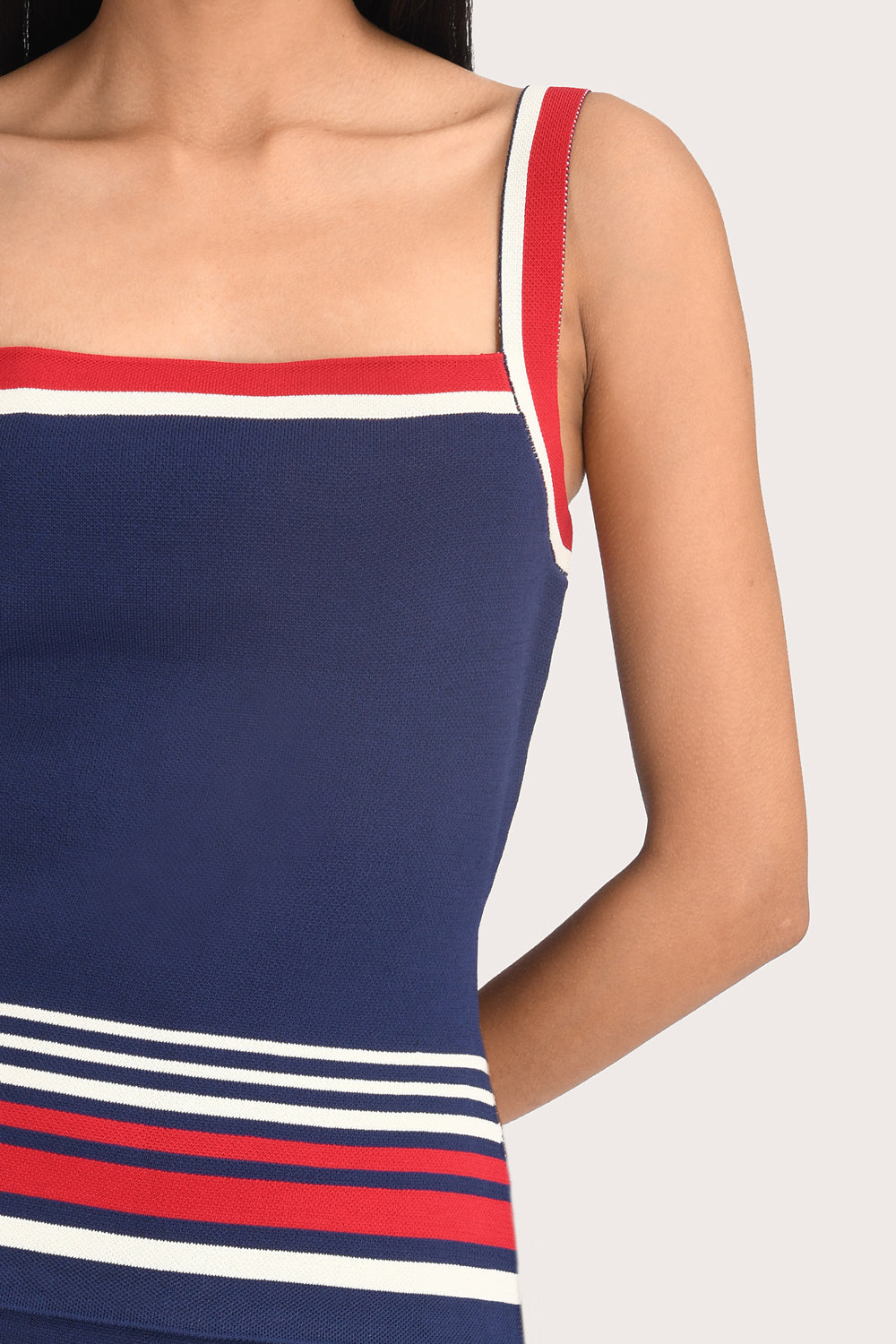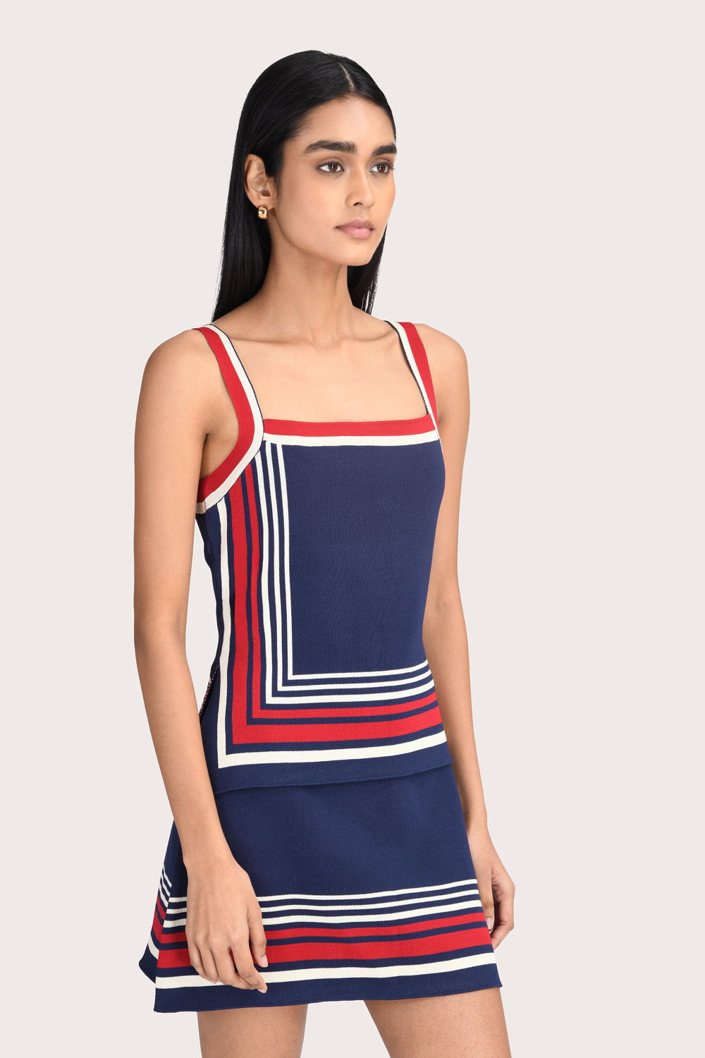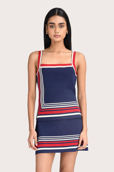 The Georgia Top in Navy is a knit style with a square neckline and red, navy and white panel detailing. This slip-on piece runs true to size for a close fit that beautifully frames the body. Pair it with the matching Georgia mini skirt for perfect set dressing.