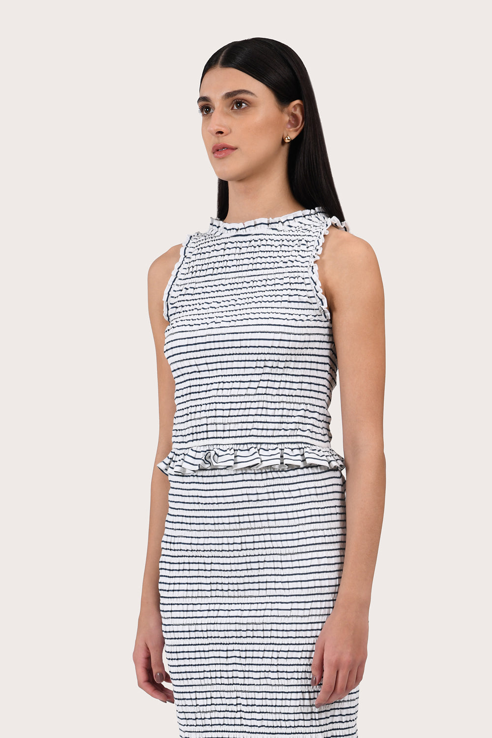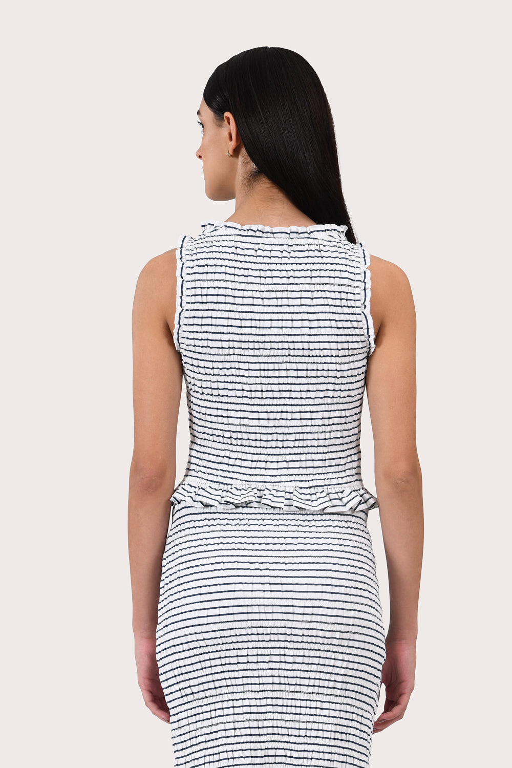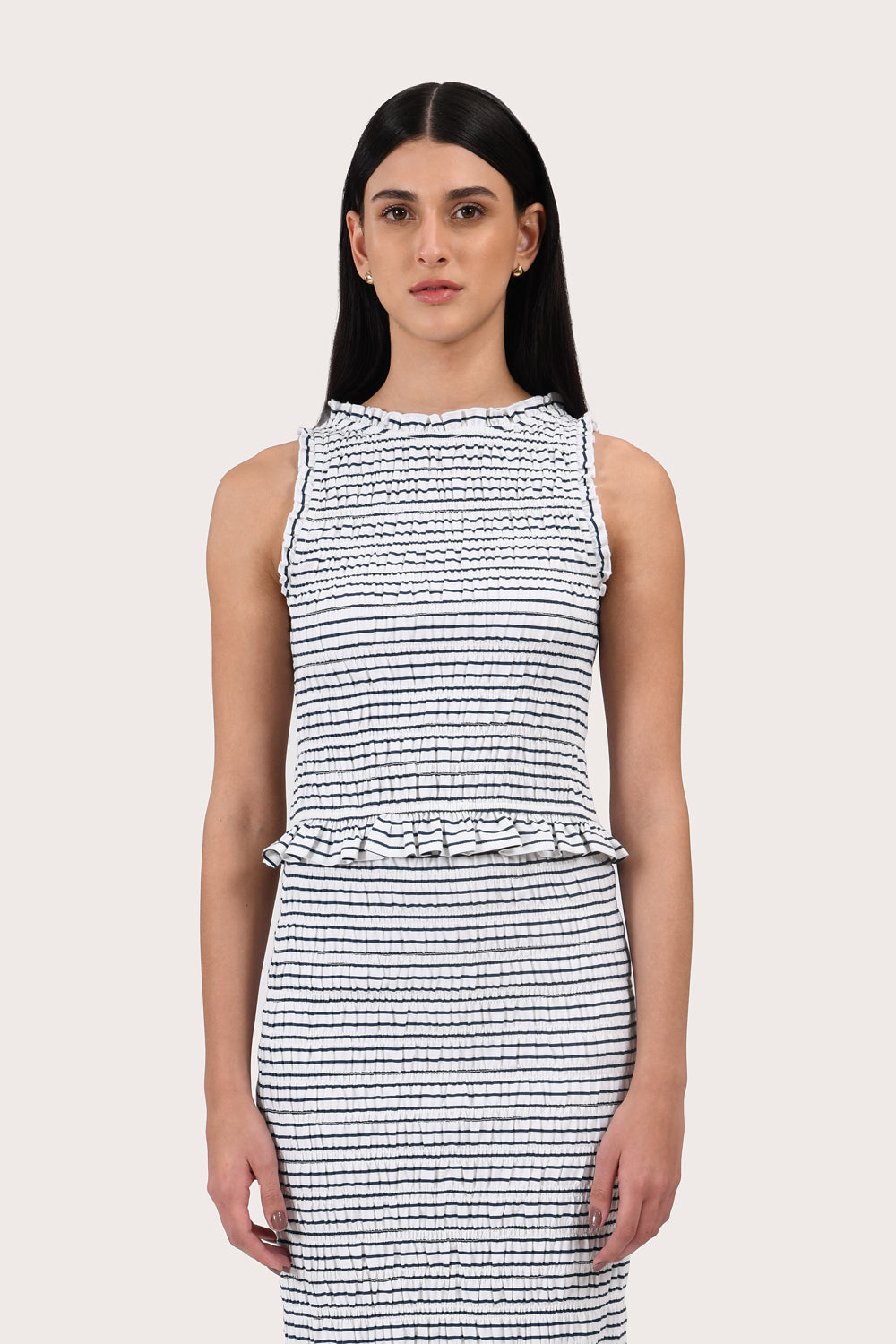 The Mara Top in Navy Stripe is a fitted jersey style defined by a fully smocked bodice and frill detailing. at the neckline and hem. Pair with the matching Mara Skirt for an easy, comfortable resort set.