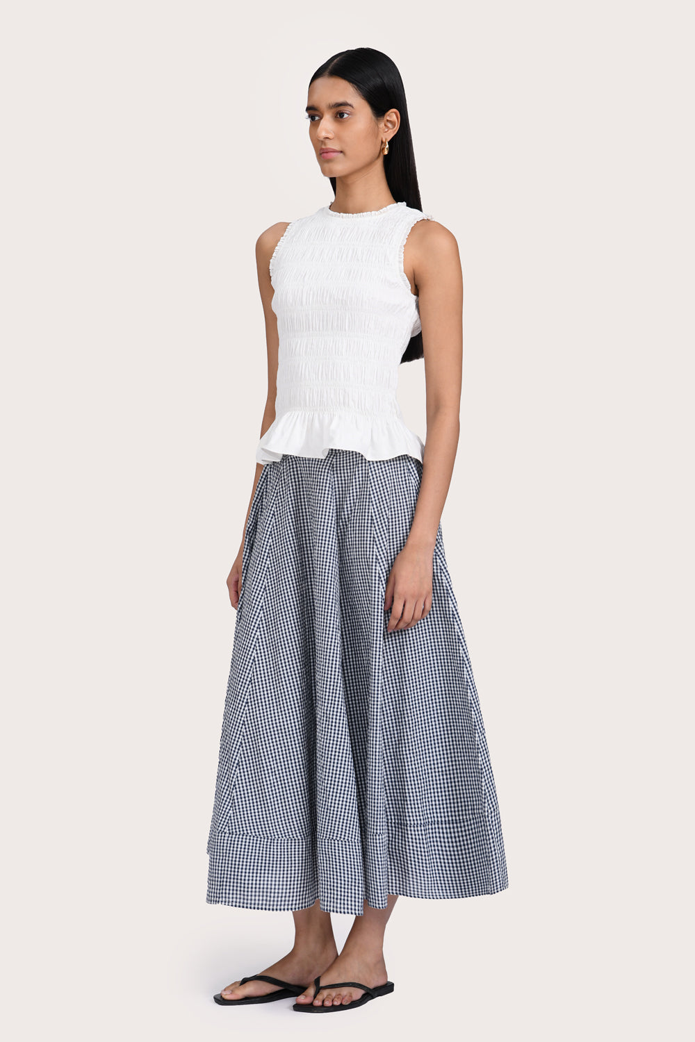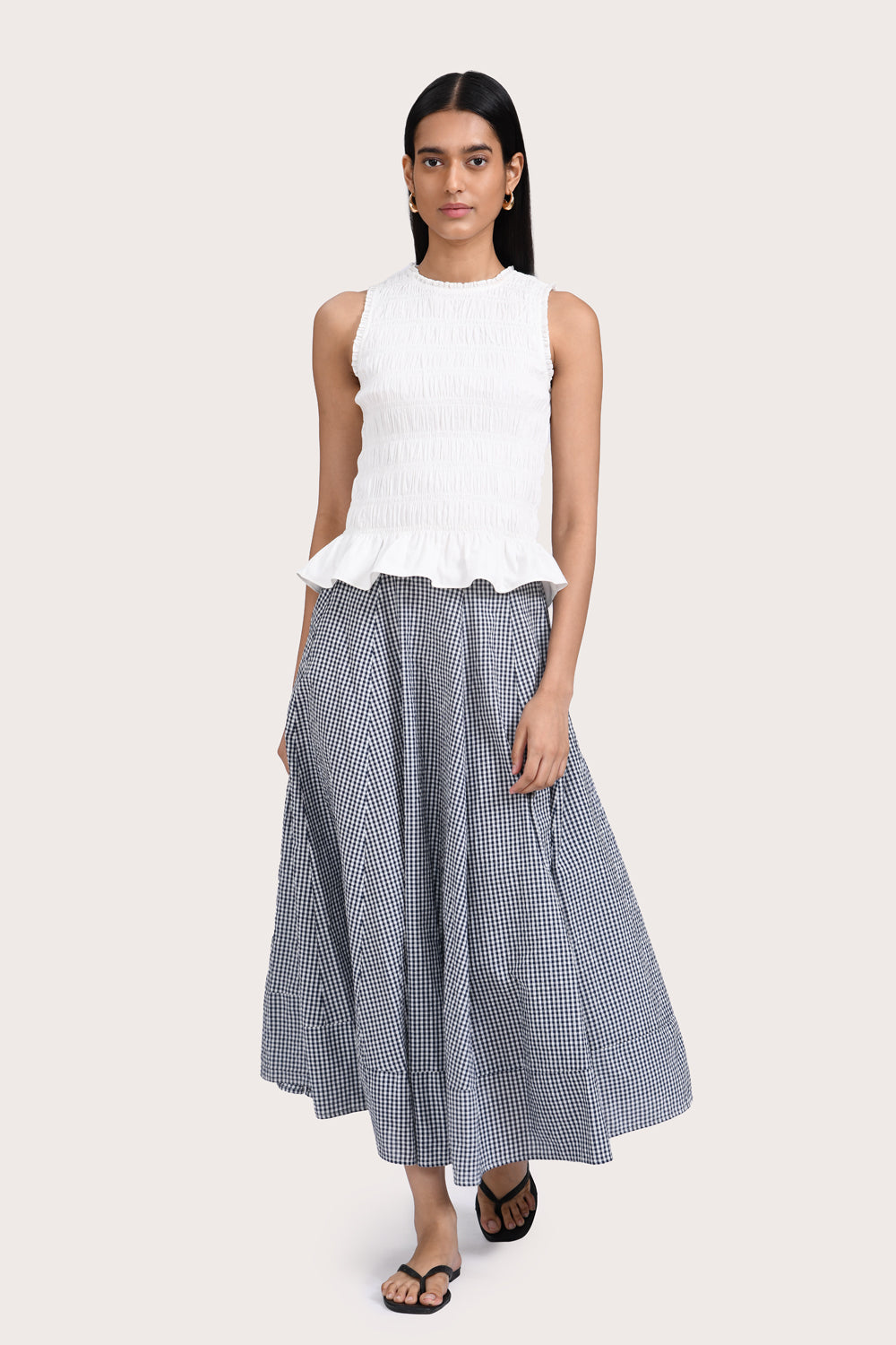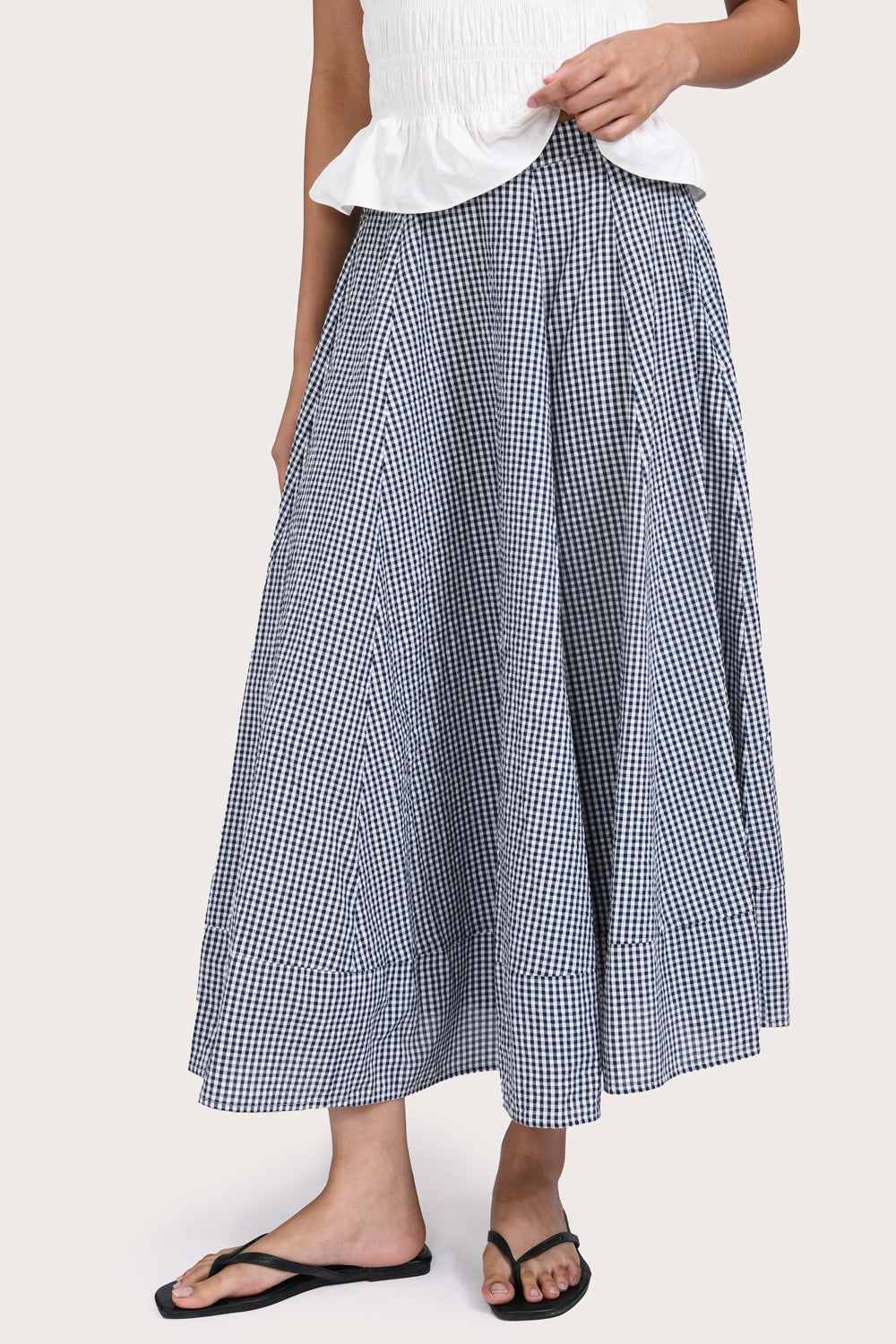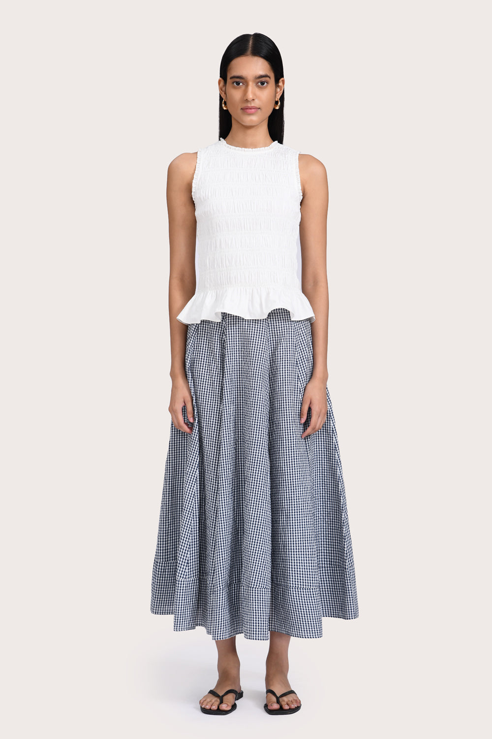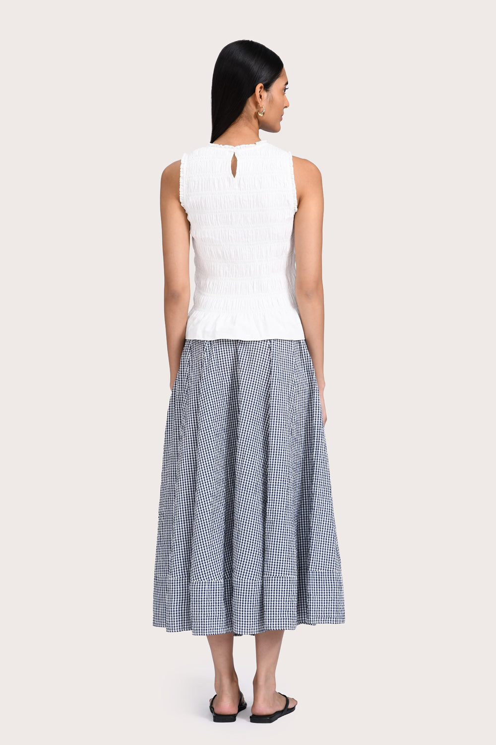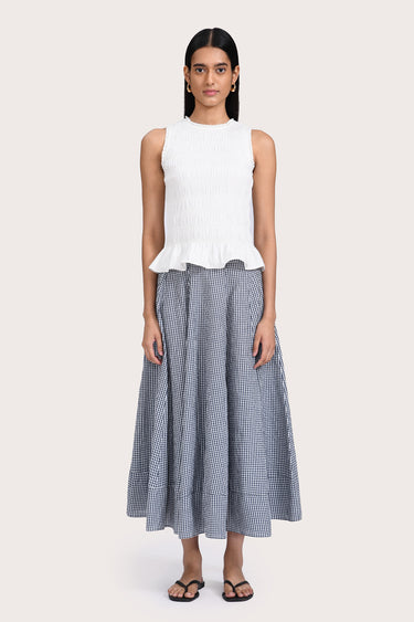 Patterned with a timeless navy gingham, the Alva Skirt is designed to sit high on the waist, with a wide hem and flattering A-line silhouette. Style yours with the Freja Vest in Red or your favourite summer basics.