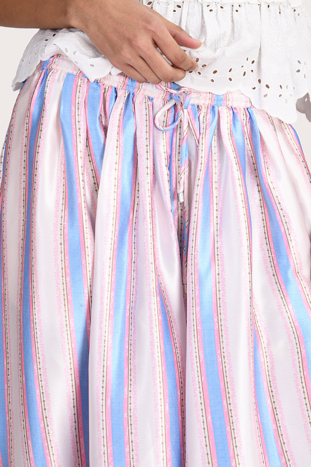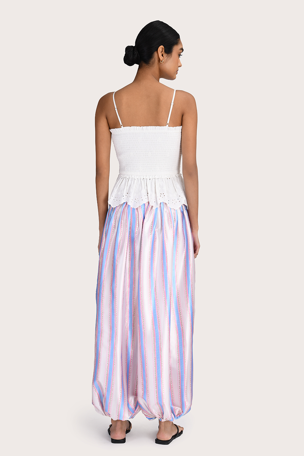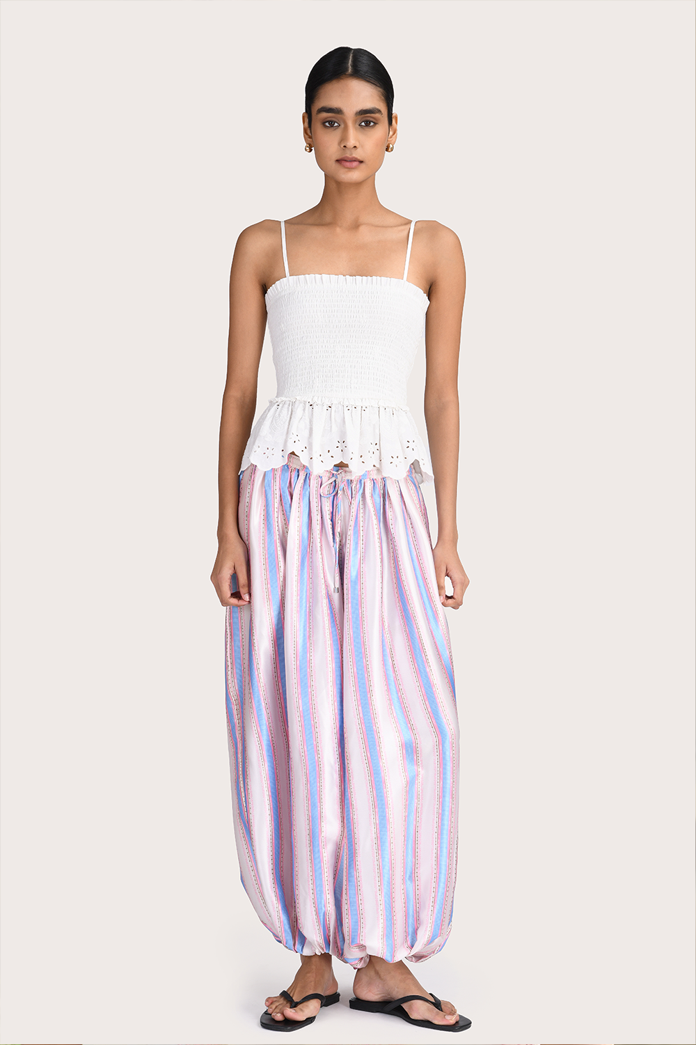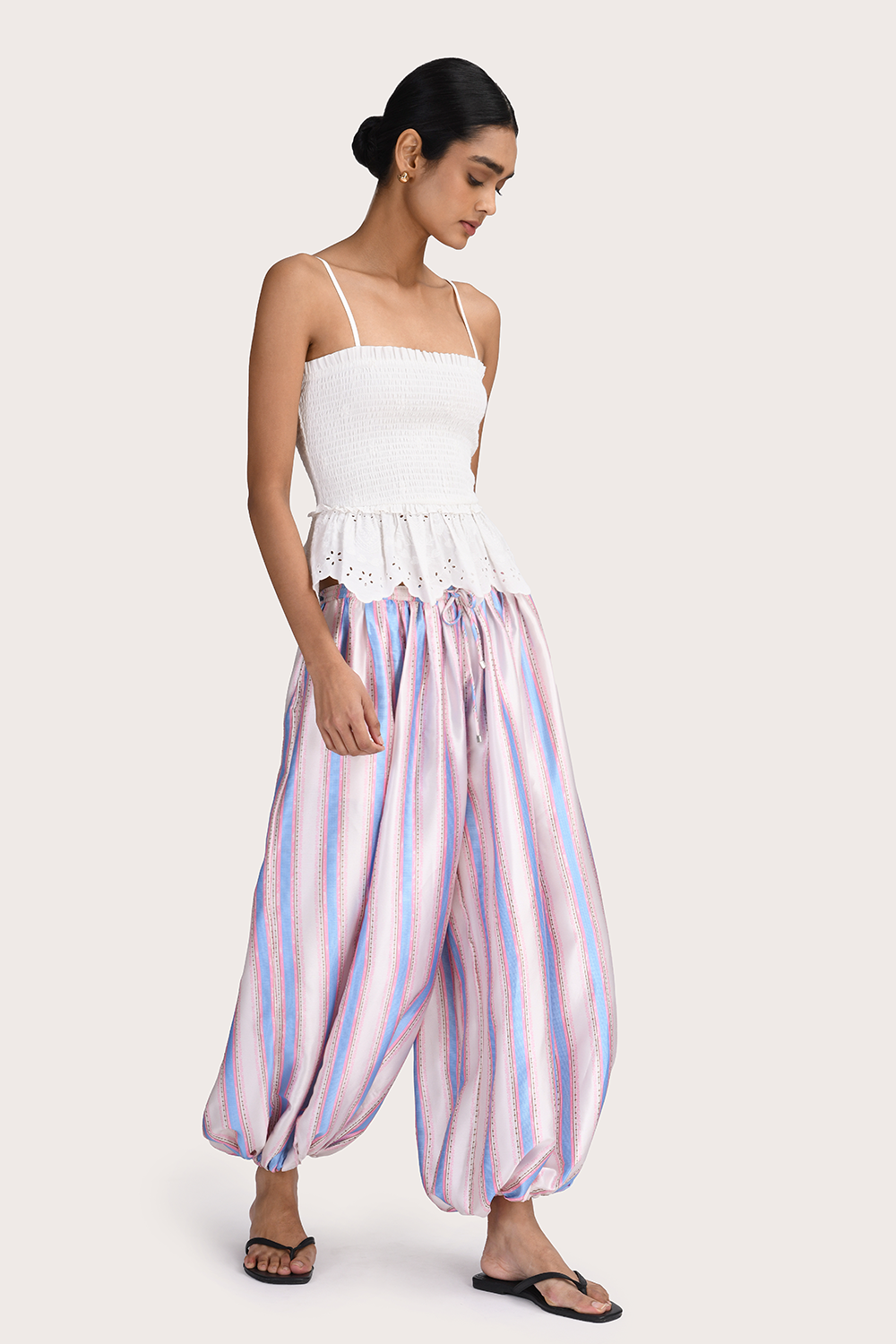 The Alexis Pant in Lavender Stripe offers a relaxed, modern silhouette defined by its distinctive balloon-leg shape. Designed with a comfortable elasticated waistband, adjustable drawstrings, and functional side pockets, the smooth satin fabrication allows for fluid, easy movement. A statement silhouette that elevates and updates your autumn wardrobe.
