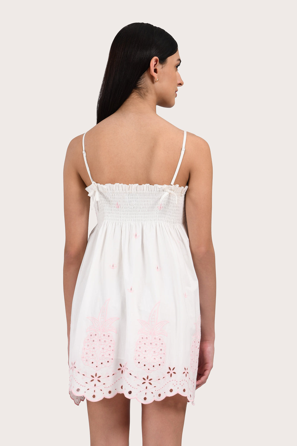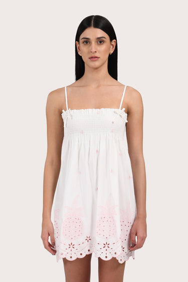 The Arlo Mini Dress in white is an effortless mini dress with a straight neckline and shirred bust for a perfect fit. Designed in crisp 60s cotton poplin, it’s the perfect dress for sunny days and vacation wardrobes.