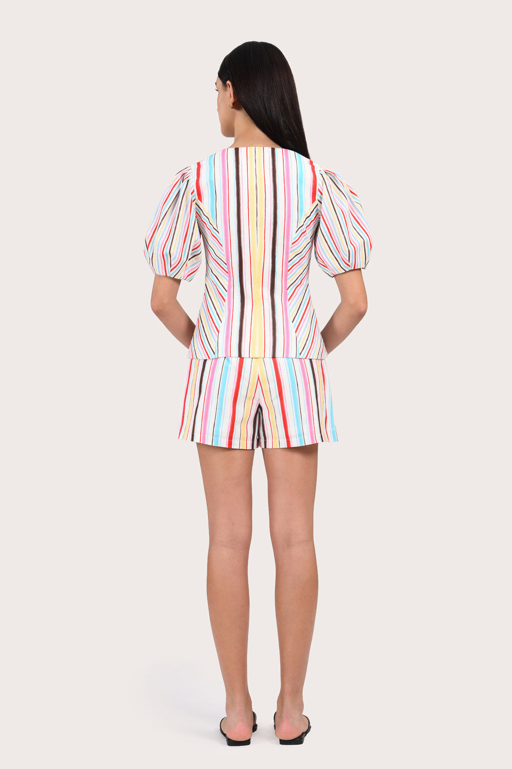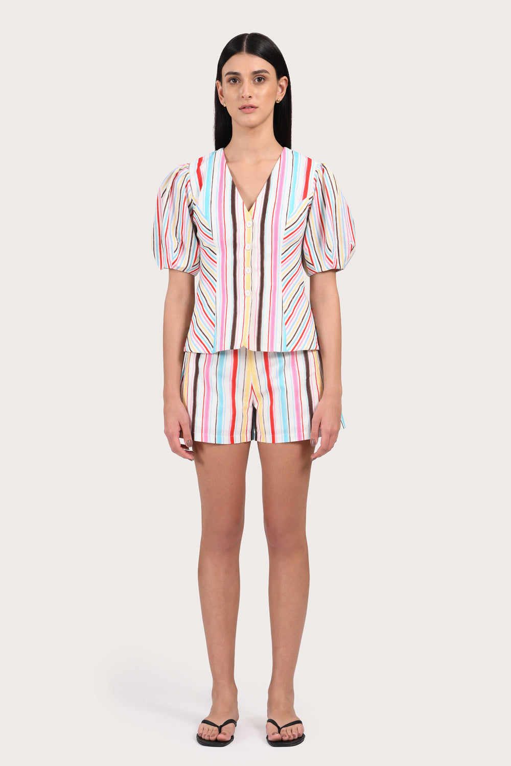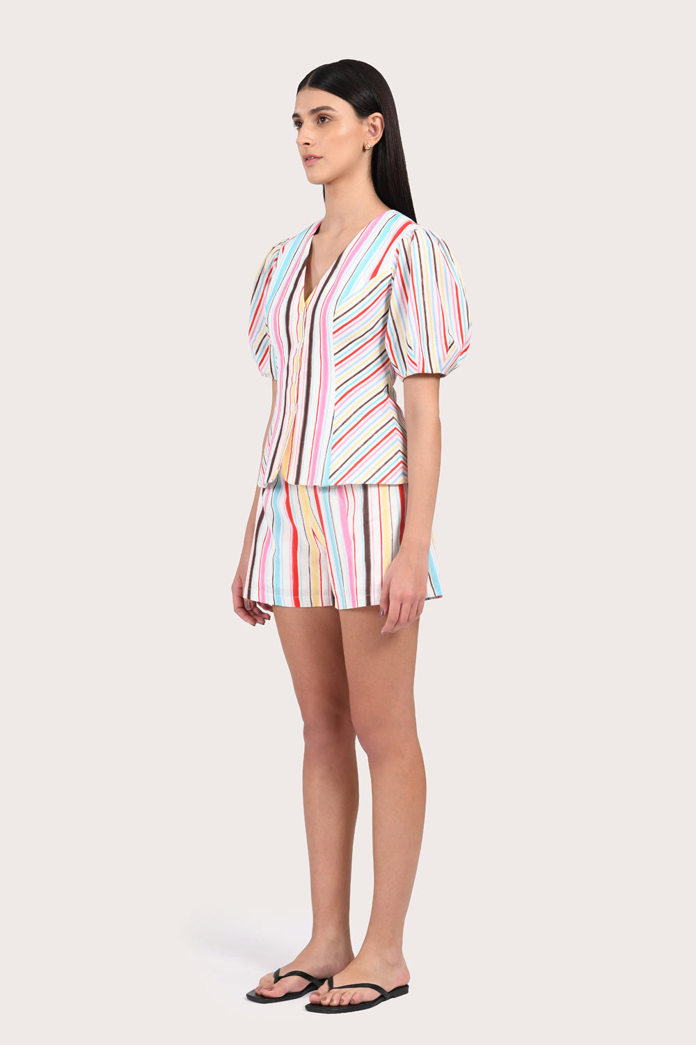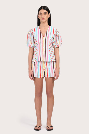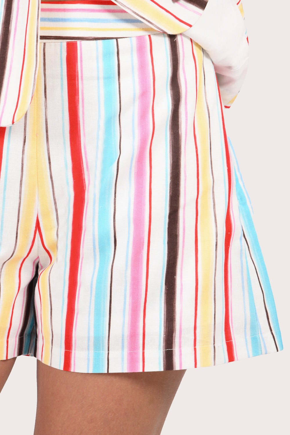 The Bruna Shorts in Rainbow Stripe are a high-waisted style crafted from structured cotton flex. Fully lined for coverage, they feature a button enclosure and practical side pockets. Style with the Bruna Blouse for a summer set, or wear with a simple tank for everyday.