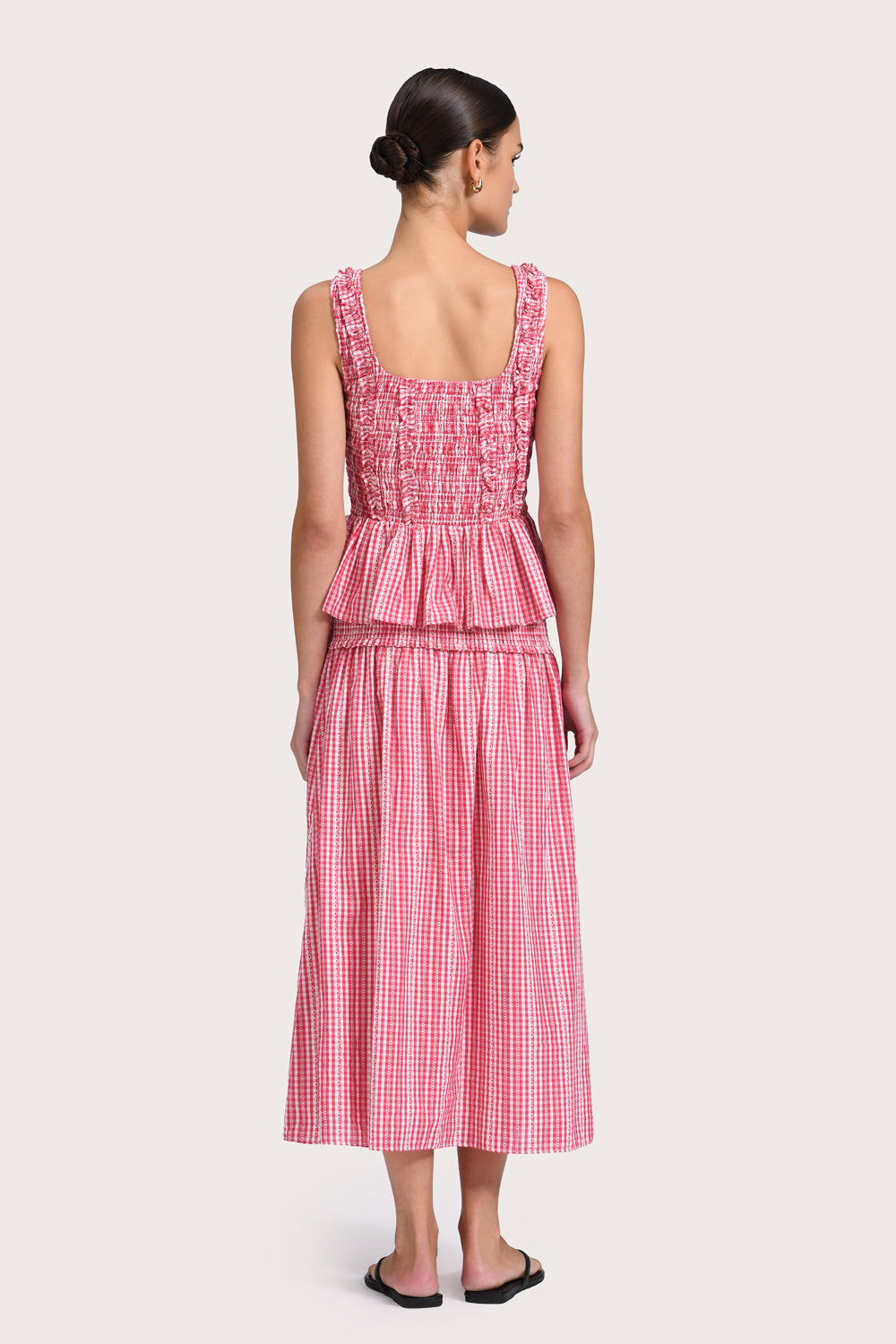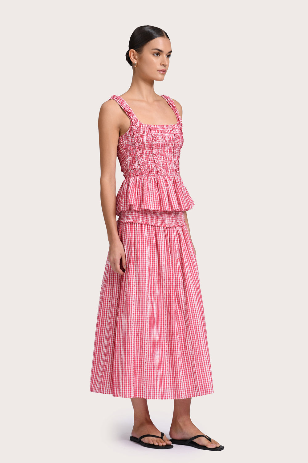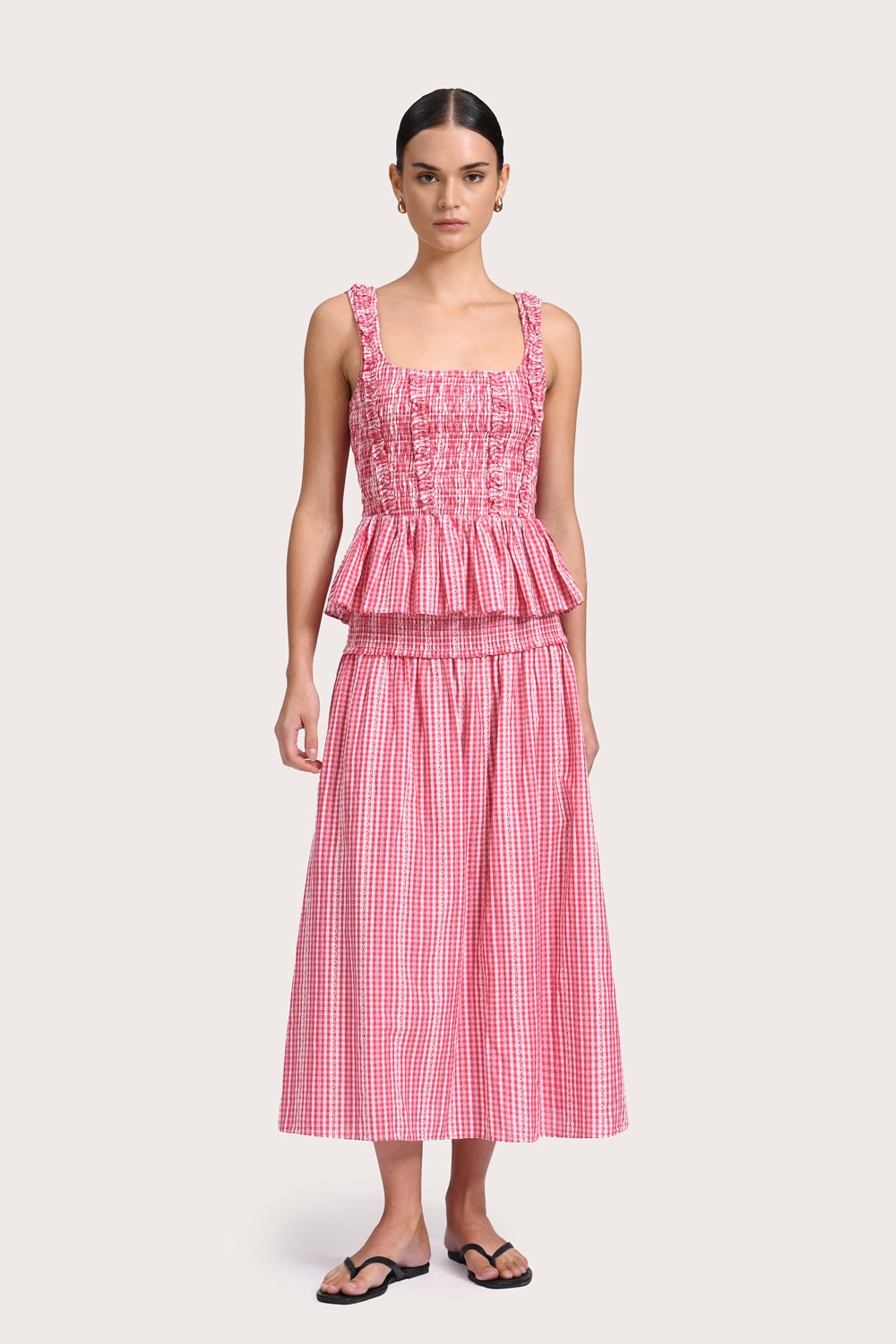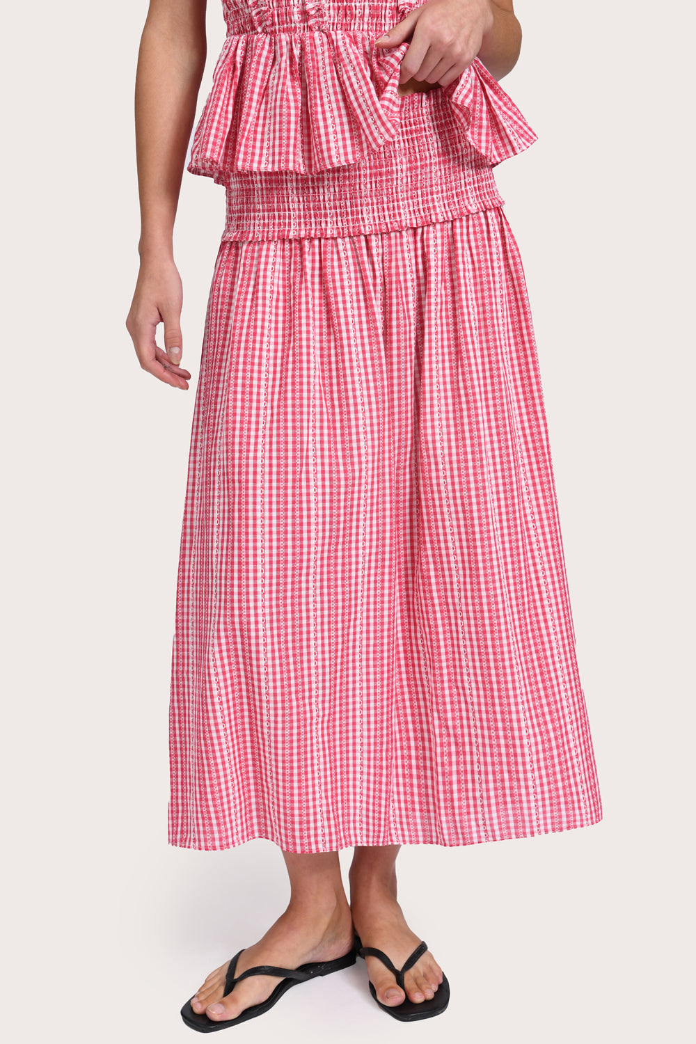 The Celia skirt in Cherry Check is designed to sit effortlessly on the hips under the matching Lula top. Elasticised for a comfortable fit, it falls into a clean A-line silhouette that finishes above the ankle.