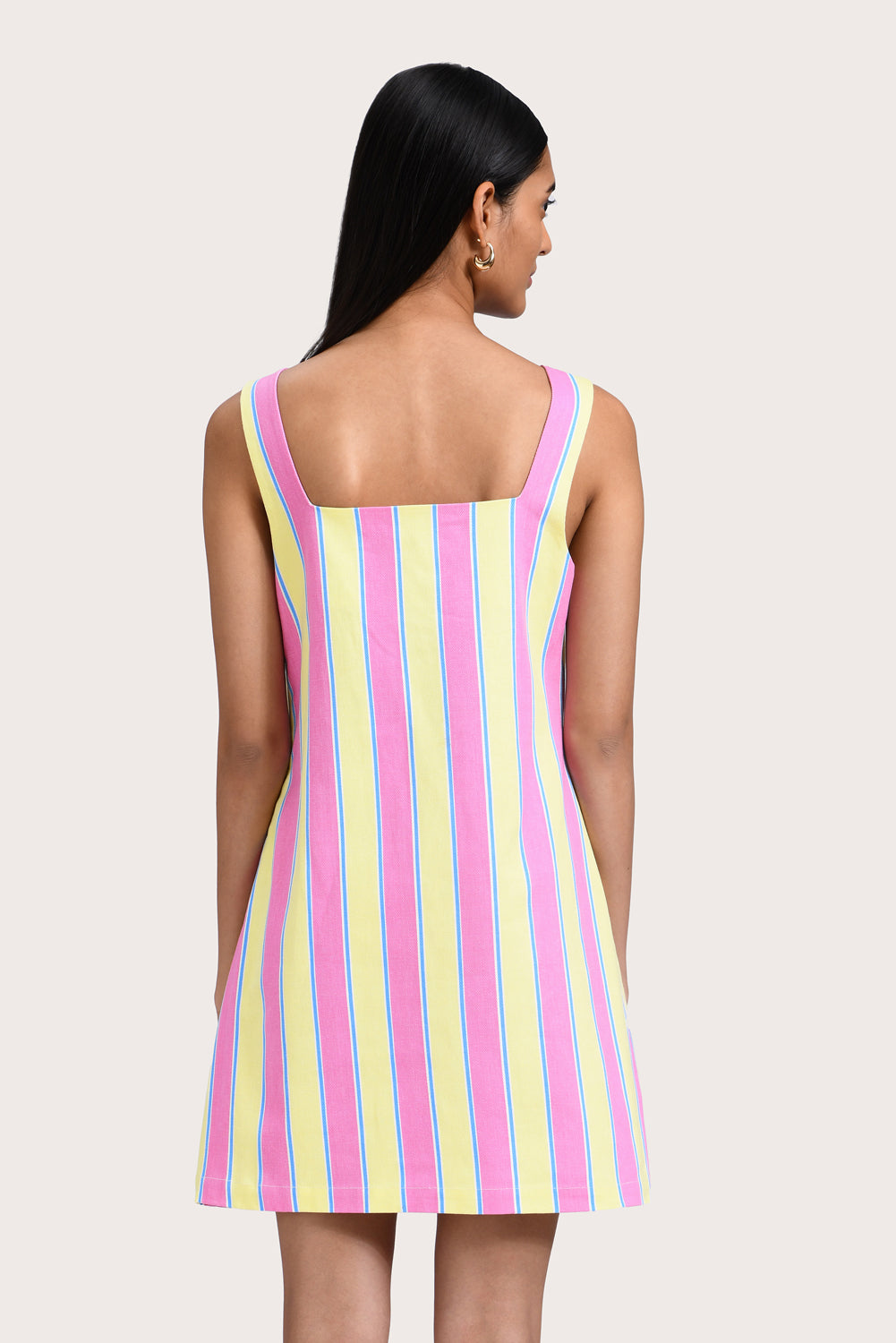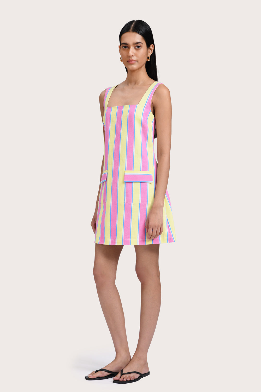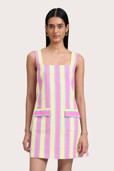 Introducing the Isla Mini dress in Fiesta strip. Featuring a square neckline and flattering An A-line silhouette This 100% cotton twill fabrication in a pink and yellow stripe balances structure with playfulness.