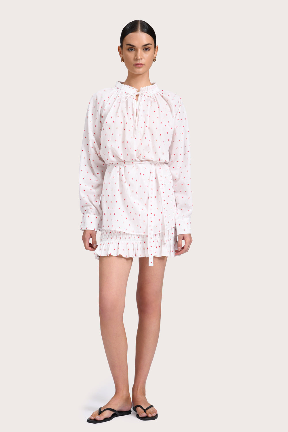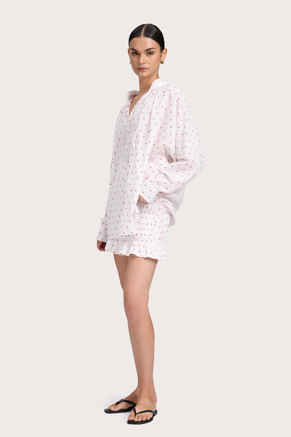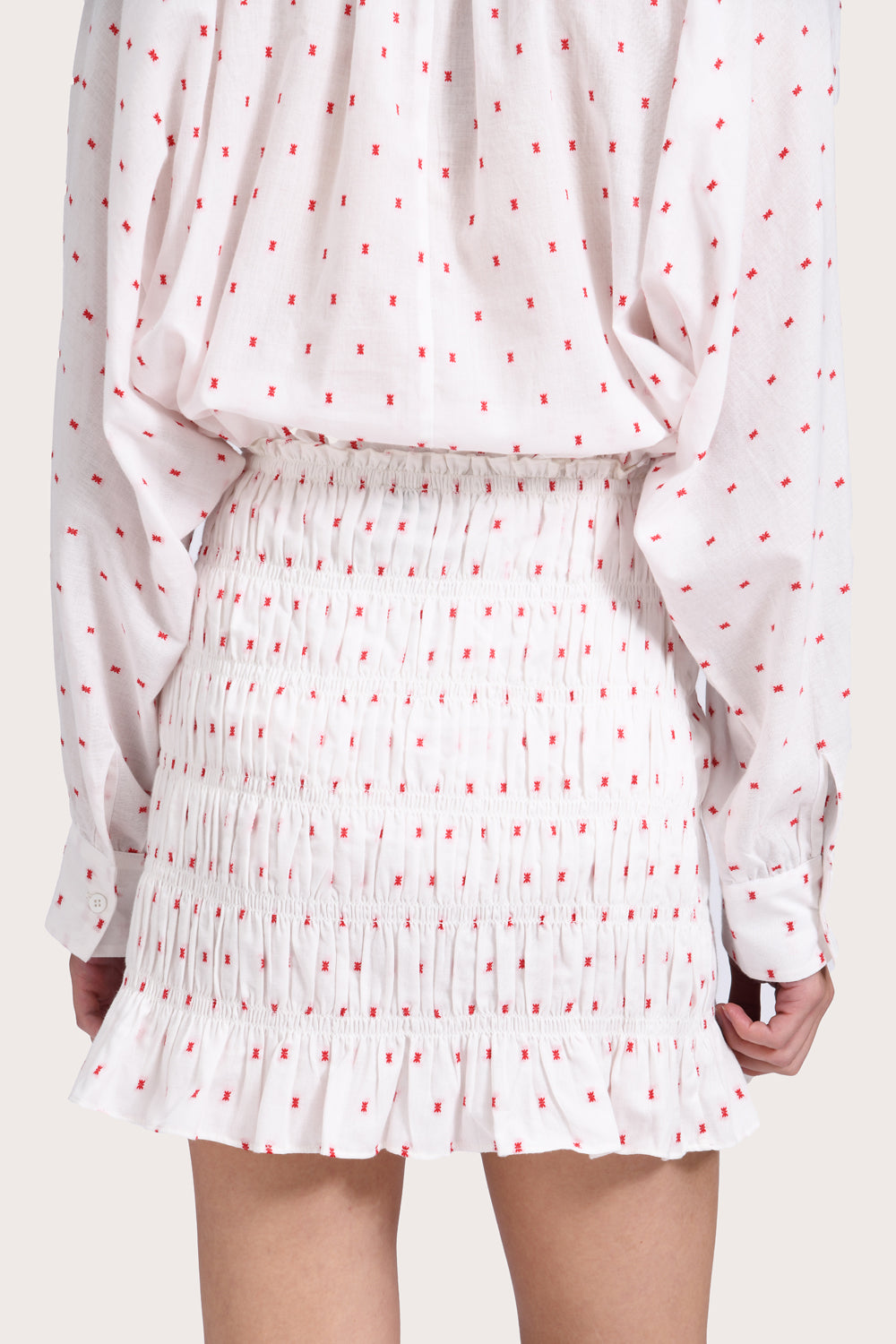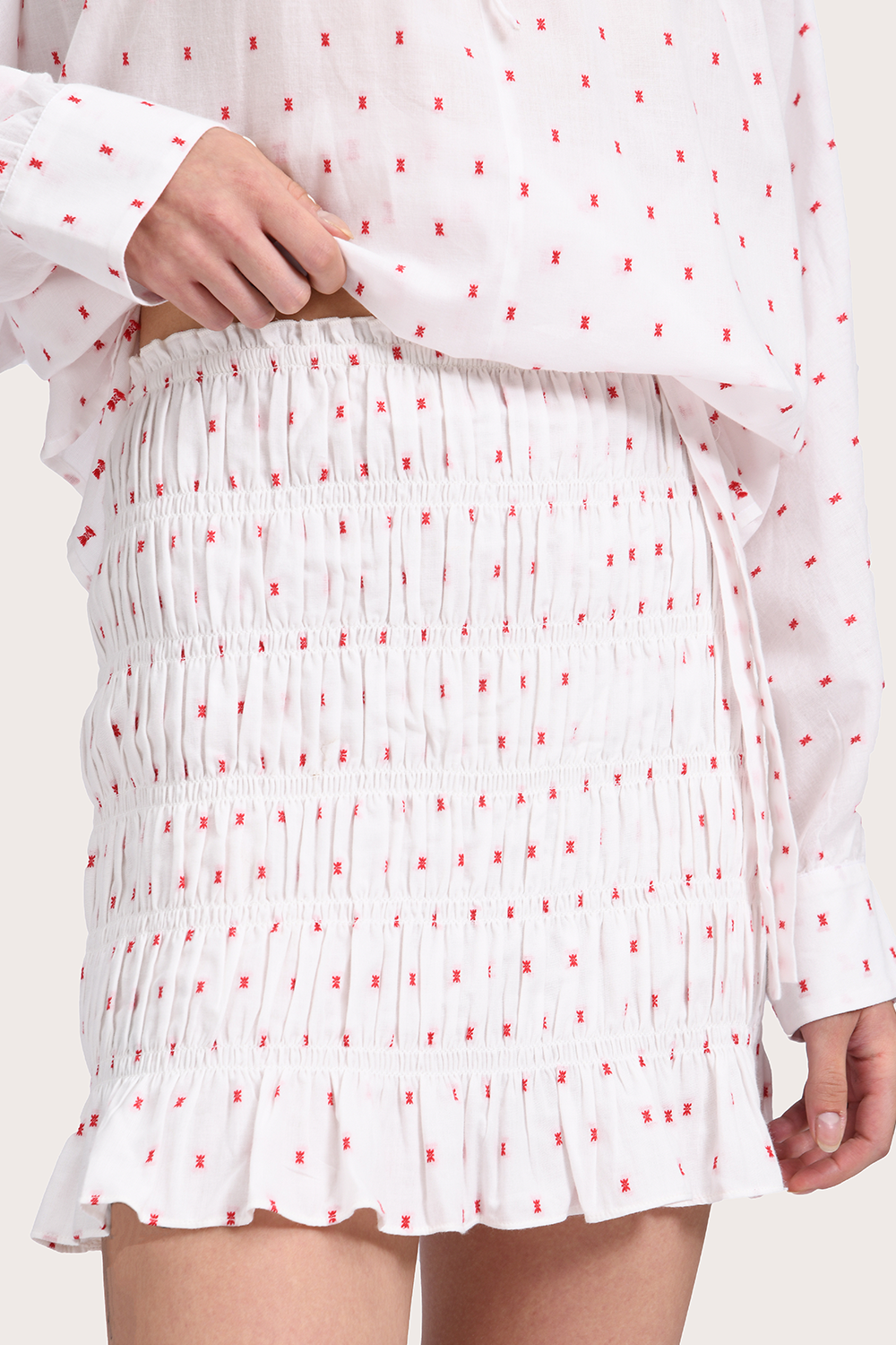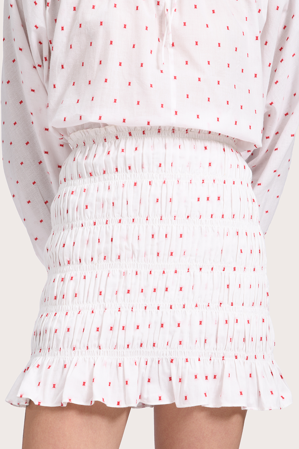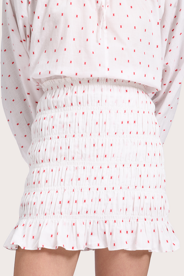 The Martina Skirt in Fiesta Flicker is crafted in a soft cotton fabric and features a fully smocked fit, finished with embroidery detail throughout and a soft ruffle hem. Pair back with the matching Reina blouse for a tonal look.