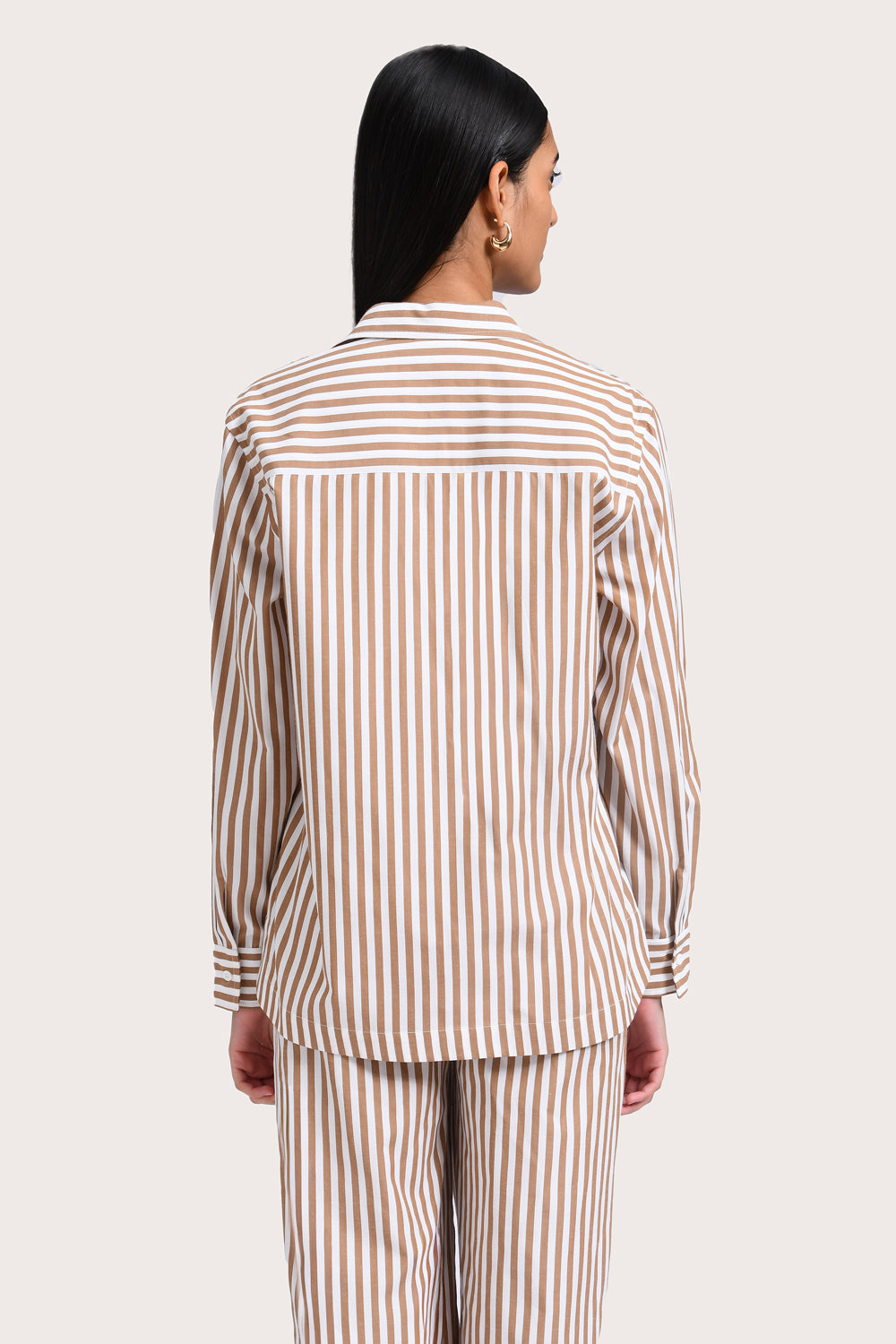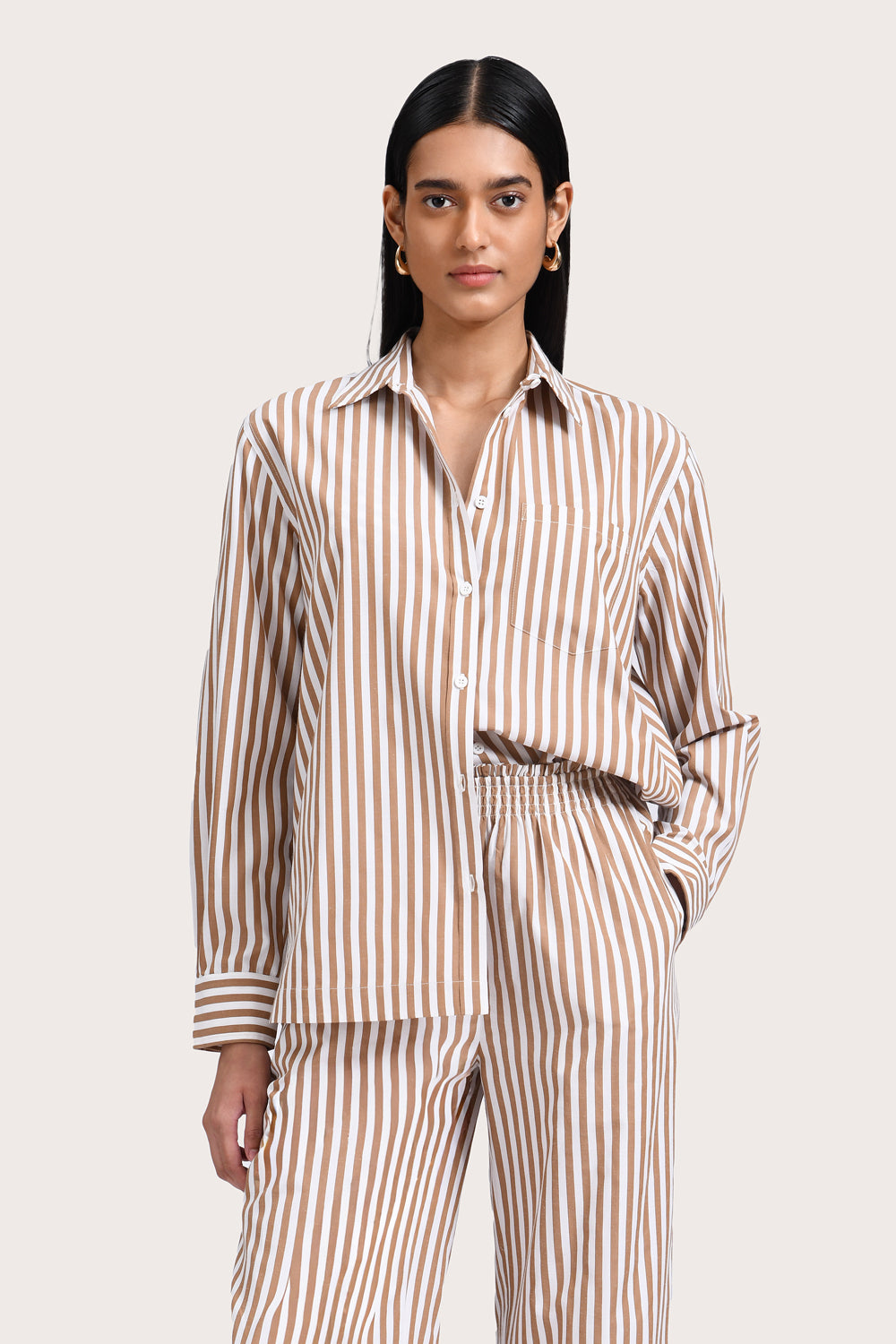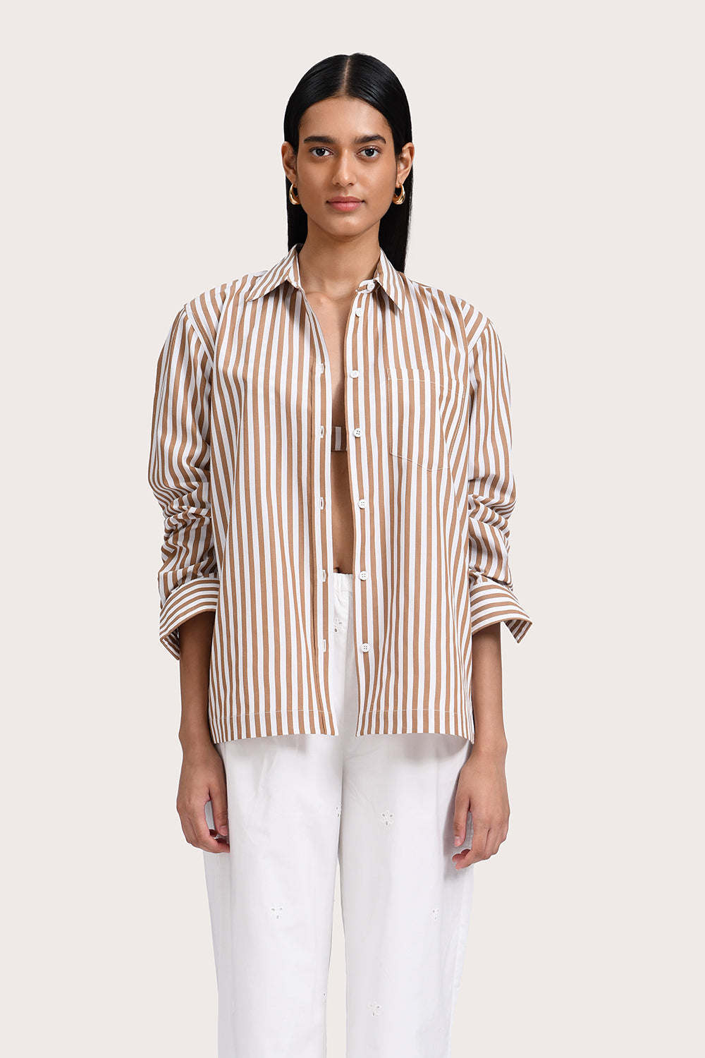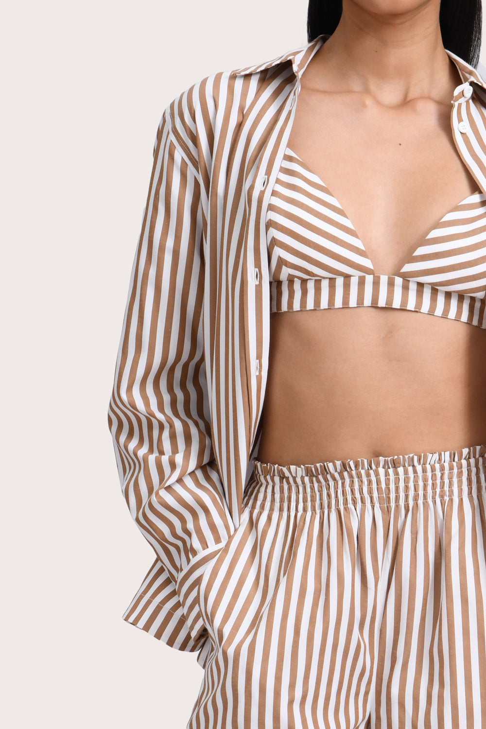 A timeless shirt for your forever wardrobe, the Nathalie in Neutre Stripe is designed for an easy, relaxed fit. It features a full button-down front, a classic collar and a chest pocket. Wear it buttoned up or open as a light layer over the Joelle Bralette.