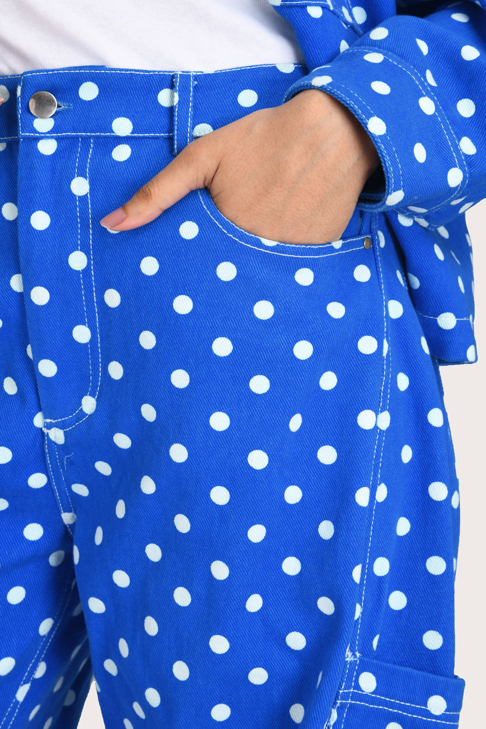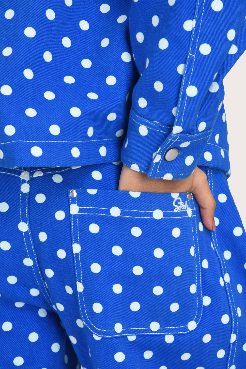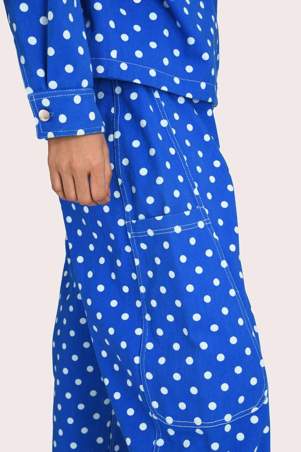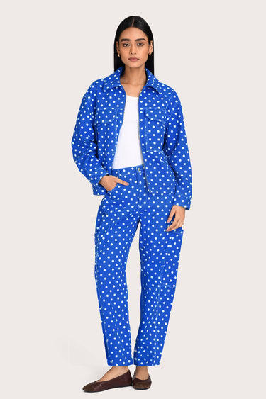 An updated version of a Steele favourite, the Zelie Pant in Blue Polka features a contemporary barrel-leg silhouette and a mid-rise fit. Crafted from 100% cotton twill with a denim-like feel. They fit true to size for a relaxed feel, pairing perfectly with the matching Zelie Jacket.